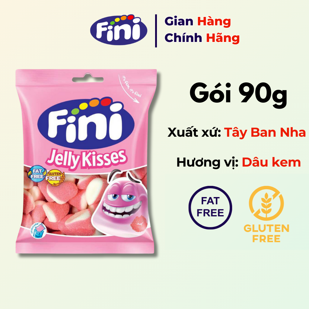 - Kẹo dẻo FINI Jelly Kisses 90g với vị dâu & kem chua chua ngọt ngọt siêu ngon. Độ dai và mềm vừa phải, phù hợp mọi lứa tuổi. - Sản phẩm được sản xuất