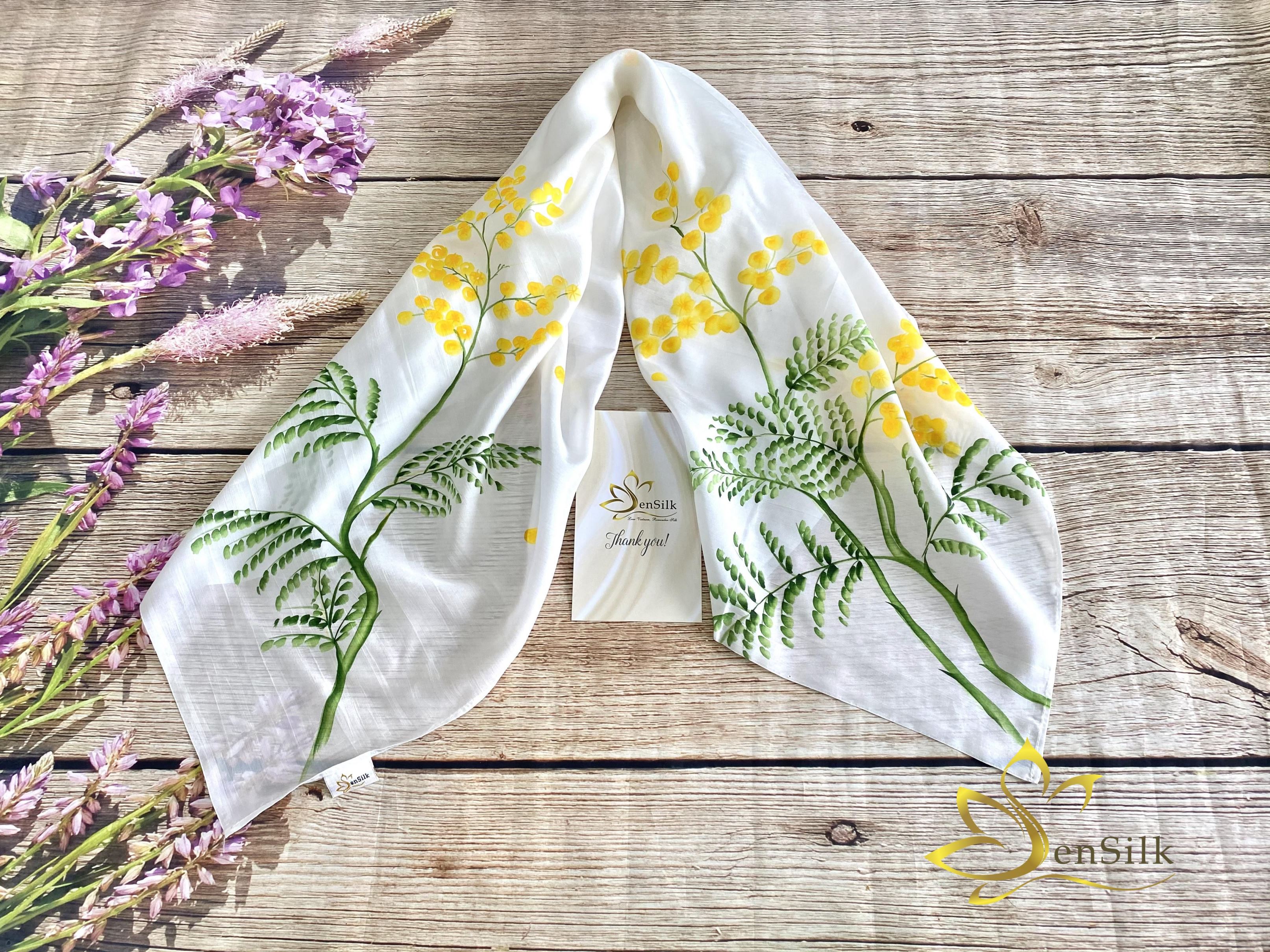 Khăn Lụa Handmade Vẽ Hoa Mimosa SenSilk – tượng trưng cho những tình cảm chân thành, thầm kín và sự cảm thông sâu sắc… Hoa Mimosa được yêu thích không chỉ bởi dáng cây đẹp, cành lá lấp lánh ánh bạc, chùm hoa vàng rực rỡ kiêu sa đầy quyến rũ mà chúng còn được yêu thích bởi chính ý nghĩa của chúng.