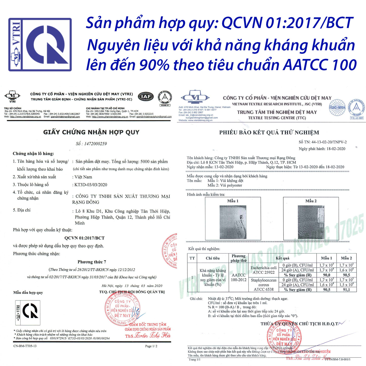 - Nguyên liệu với khả năng kháng khuẩn, tỷ lệ suy giảm của vi khuẩn lên đến 90% theo tiêu chuẩn AATCC 100-2012 được giám định bởi Viện Nghiên Cứu Dệt May TPHCM