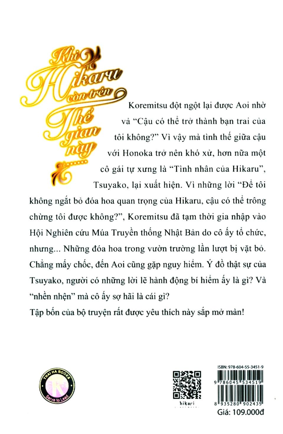 Khi Hikaru còn trên thế gian này…là series light novel tiếp theo của bộ đôi tác giả Nomura Mizuki và họa sĩ Takeoka Miho, bộ đôi nổi tiếng đã cùng tạo nên một Cô gái văn chương sâu sắc, li kì và nhận được sự yêu thích từ đông đảo bạn đọc trên khắp thế giới. Khi Hikaru còn trên thế gian này…… là một trong những bộ light novel hiếm hoi thuộc thể loại lãng mạn, drama không có bản chuyển thể anime nhưng vẫn thu hút được sự quan tâm, tranh luận sôi nổi của độc giả. Một series truyện tranh ngắn chuyển thể lại tập 1 của Khi Hikaru còn trên thế gian này…… với tên gọi Aoi – cùng tên với tập 1 của series light novel. Series Khi Hikaru còn trên thế gian này…… gồm 10 tập, lấy cảm hứng từ trường thiên tiểu thuyết “Truyện kể Genji” cực kỳ nổi tiếng của văn học Nhật Bản thời Heian, mỗi tập truyện sẽ tập trung vào một nhân vật riêng biệt, lấy nguyên mẫu từ những người tình mà hoàng tử Genji yêu tha thiết, tuy nhiên tuyến nhân vật chính vẫn được giữ nguyên xuyên suốt cả 10 tập.