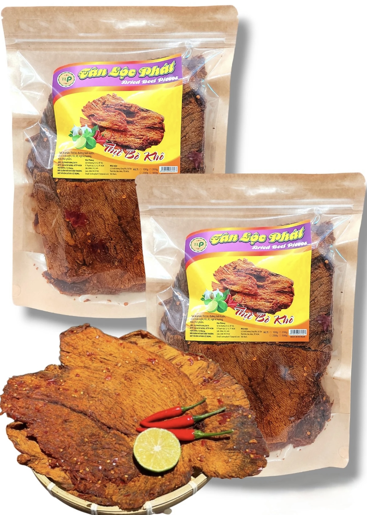 Khô bò được làm từ 100% thịt bò tươi Không chất bảo quản độc hại Được công nhận là Hàng Việt Nam Chất Lương Cao do người tiêu dùng bình chọn Được chứng nhận An