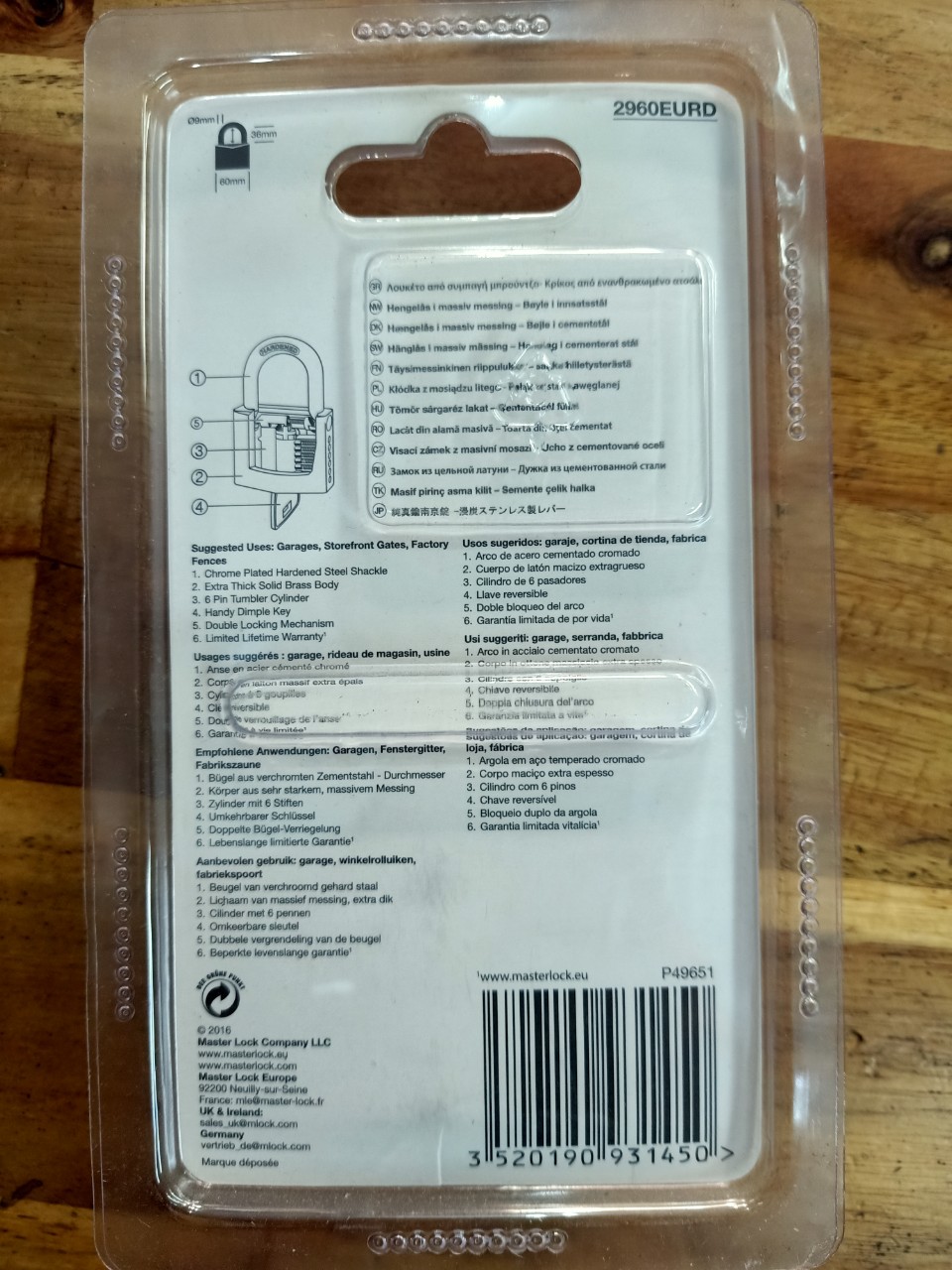 Ổ khóa Master Lock 2840EURD có thân khóa bằng đồng nguyên khối rộng 40mm, chắc chắn, bền và chống ăn mòn. Càng khóa có đường kính 6 mm dài 24mm và ngang 22mm được làm