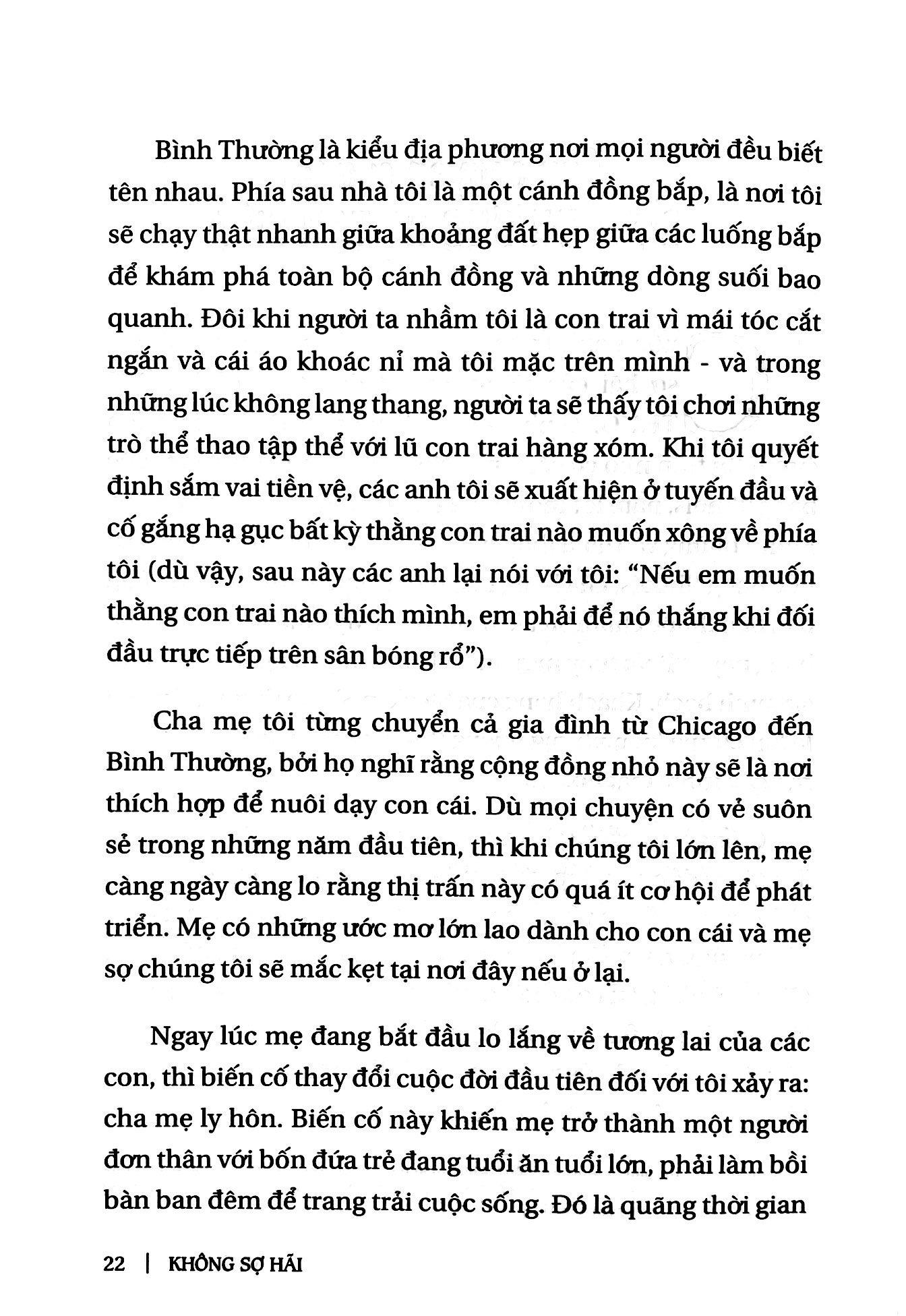 Không sợ hãi là lời kêu gọi hành động cho những người muốn tìm kiếm, xây dựng một cuộc sống phi thường và mang đến sự thay đổi lớn lao. Khi Chủ tịch Hội Địa lý quốc gia Mỹ Jean Case quyết định nghiên cứu các giá trị cốt lõi của những nhà kiến tạo vĩ đại, trong quá khứ cũng như hiện tại, từ những nhà sáng chế đến những nhà cách mạng, bà tìm thấy 5 đặc điểm chung đáng ngạc nhiên. Họ không phải là những giàu có, có đặc quyền hay thậm chí là không phải là thiên tài, mà họ là những người khác biệt dám “cược lớn”, can đảm chấp nhận mạo hiểm, biến thất bại thành những bài học ý nghĩa, không ngại vươn xa và để cho sự cấp bách chinh phục nỗi sợ hãi.  Trong cuốn sách Không sợ hãi, Jean Case khắc họa rõ nét 5 nguyên tắc này thông qua nhiều câu chuyện sống động – từ kinh nghiệm chuyển đổi của cá nhân bà, tới câu chuyện ấn tượng của Jane Goodall Tiến sĩ, Hiệp sĩ Hoàng gia Anh trong việc thấu hiểu và bảo vệ loài tinh tinh, quyết định của đầu bếp nổi tiếng José André trên con đường trở thành “người phản ứng đầu tiên” và đưa nhà bếp của anh đến những nơi bị bão tàn phá để chăm sóc những người bị đói, cho tới nỗ lực đầy tham vọng của Bryan Stevenson – luật sư, nhà hoạt động xã hội – nhằm chấm dứt tình trạng bất bình đẳng, và nhiều câu chuyện khác nữa…. Bà chia sẻ các góc nhìn mới mẻ sâu sắc cùng những câu chuyện mà có thể bạn đọc từng biết tới – như câu chuyện của AirBnB khởi đầu từ con số không trở thành ngành công nghiệp khách sạn, hay quyết định chinh phục Mặt trăng của nhân vật làm nên lịch sử - Tổng thống John F. Kennedy, và nhiều viên ngọc quý từ những người kiến tạo sự thay đổi mà bạn chưa từng nghe nói.  Bằng cách kết hợp các câu chuyện, những lời khuyên thực tế và truyền cảm hứng, Không sợ hãi chỉ cho bạn đọc cách áp dụng thành công 5 nguyên tắc không sợ hãi vào đời sống, từ đó châm ngòi cho những ý tưởng đột phá góp phần thay đổi thế giới chúng ta đang sống theo cách tốt đẹp hơn: Dám cược lớn. Có rất nhiều người, nhiều tổ chức có tính cẩn trọng tự nhiên. Họ thường xem cách nào đã có tác dụng trong quá khứ rồi cố gắng lặp lại cách làm đó, nhưng chỉ dẫn tới sự gia tăng về lượng. Mọi biến đổi làm nên lịch sử thật sự chỉ xảy ra khi người ta quyết định thực hiện những thay đổi có tính cách mạng. Can đảm chấp nhận mạo hiểm. Hãy dám thử những điều mới mẻ, chưa ai từng trải qua và tiếp tục thử nghiệm. Chấp nhận mạo hiểm không giống như nhắm mắt lại để nhảy qua vực sâu mà là một quá trình dài để thử và sai. Biến thất bại thành những bài học ý nghĩa. Những thành tựu gia vĩ đại coi thất bại là phần cần thiết của cuộc hành trình đi tới thành công. Người ta không tìm kiếm thất bại, nhưng khi thất bại xảy ra, những nhà đổi mới vĩ đại sẽ tìm kiếm ý nghĩa đằng sau cú vấp ngã đó, phát huy bài học họ rút ra được và chia sẻ kinh nghiệm cùng người khác. Vượt khỏi vùng an toàn. Xã hội chúng ta luôn chìm đắm trong những huyền thoại về các thiên tài đơn độc. Nhưng sự đổi mới xảy ra nhờ có sự giao lưu. Việc xây dựng các mối quan hệ tốt đẹp với mọi người xung quanh, nhất là những người có kinh nghiệm đa dạng sẽ tạo nên những sự vươn xa đầy bất ngờ cho chính người trong cuộc. Để sự cấp bách chinh phục nỗi sợ hãi. Đừng nghĩ quá nhiều mà cũng đừng phân tích quá độ. Mong muốn tìm hiểu một vấn đề từ mọi góc độ là hết sức tự nhiên, nhưng tìm hiểu quá mức có thể khiến cho nỗi sợ làm bạn tê liệt. Hãy để cho nhu cầu khẩn thiết xử lý mọi hoài nghi và tư tưởng thoái lui. Điều đơn giản bạn cần nghĩ đến là hãy làm thôi. Năm nguyên tắc này có thể được tóm gọn trong cụm từ: Không sợ hãi. Khi tập hợp cùng nhau, năm nguyên tắc này sẽ tạo thành một lộ trình kiến tạo thay đổi cho mọi người, từ mọi lĩnh vực trong cuộc sống, nhưng có một điều quan trọng bạn cần nhớ, rằng đây không phải là “quy luật”. Hãy nghĩ những nguyên tắc này là một bộ tiêu chuẩn có thể giúp chúng ta nhận biết khi nào thì những quyết định được hình thành trên tinh thần không sợ hãi.