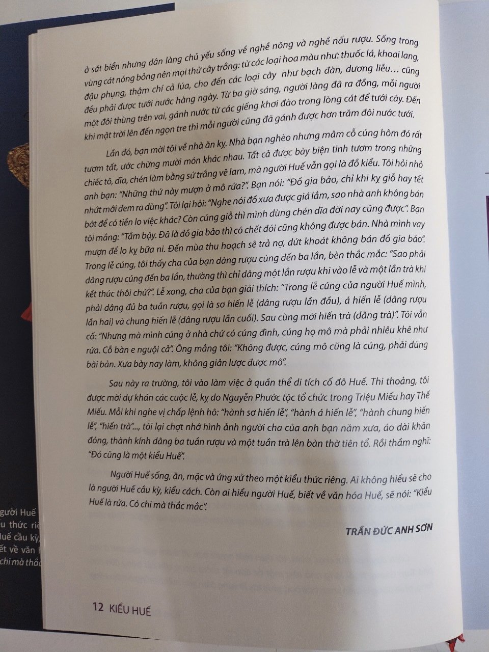 Mua tại TiktokSách mới Kiểu Huế Tác giả: Trần Đức Anh Sơn Nxb Tổng hợp TP Hồ Chí Minh, phát hành vào 12/2021. Sách khổ 1827cm, (khổ như cuốn Từ điển nhà Nguyễn), bìa cứng có áo bìa, ruột in 4 màu, có 450 ảnh minh họa nội dung bài viết. Bản giới hạn đánh số Có ký tặng của tác giả. … Giới thiệu: Dưới đây là mục lục của sách, có bổ sung 12 bài, là những bài có đánh dấu (), so với bản in lần đầu: THAY LỜI TỰA LỄ NGHI & LỐI SỐNG Lễ hội cung đình triều Nguyễn Tết Huế Lễ tết ở Huế (*) Xuân du phương thảo địa Thu vàng xứ Huế Hoa của làng CHỐN Ở Phủ đệ - nơi lưu giữ Huế xưa Vương phủ của Thi Ông, Thi Bá Hồn Huế trong Lạc Tịnh Viên