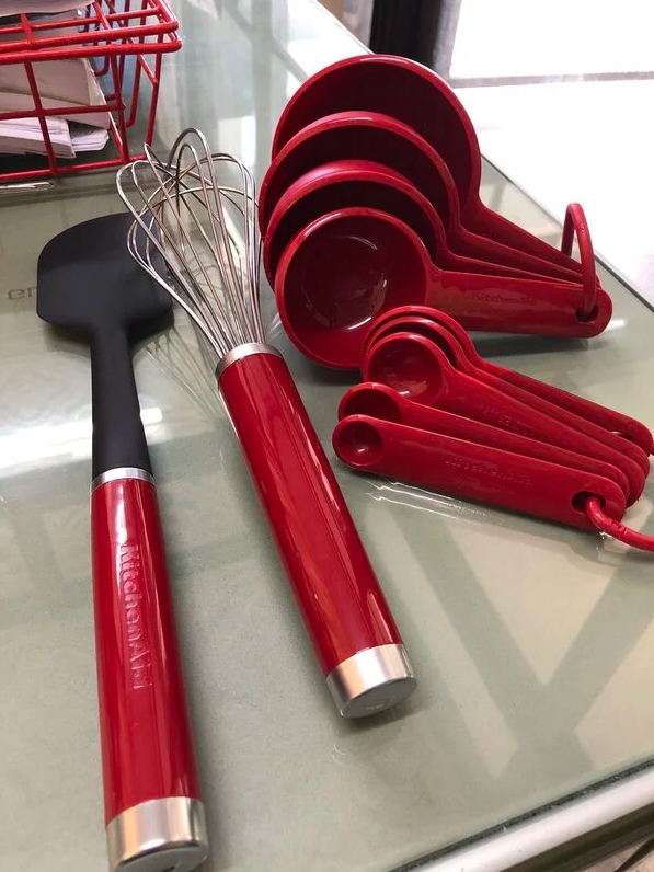 • 5 muỗng đong định lượng màu đỏ: 15ml, 7,4ml, 5ml, 2,5ml, 1,25ml • 4 muỗng đong định lượng sâu lòng màu đỏ: ¼ cup, ⅓ cup, ½ cup và 1 cup (237ml) • 1 đánh trứng màu đỏ • 1 spatula màu đỏ