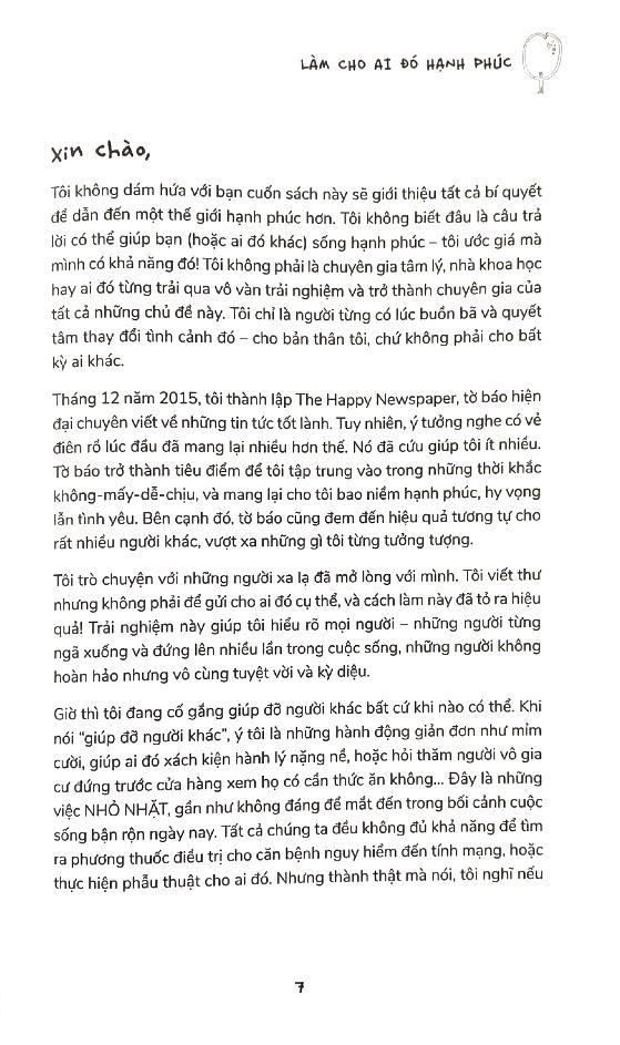 Làm Cho Ai Đó Hạnh Phúc - Make Someone Happy Cuốn sách này sẽ khiến bạn hạnh phúc. Trong một thế giới ảm đạm, người ta dễ bị mắc kẹt trong vòng xoáy tiêu cực. Hãy để cuốn sách tươi sáng, vui vẻ và đầy sáng tạo này xua tan mây mù trong cuộc sống của bạn: Tìm một tin tức tích cực trong tuần và dán vào trang sổ nhật ký của m.ình. Viết ra những điều khiến bạn mỉm cười hôm nay. Gửi đến bạn bè một “giỏ yêu thương” chứa đầy những lời nhắn vui tươi và món ăn vặt yêu thích của họ. Gây bất ngờ cho người lạ khi trả tiền cà phê cho họ. LÀM CHO AI ĐÓ HẠNH PHÚC nhắc bạn nhớ rằng những điều nhỏ nhặt tuyệt vời đang diễn ra mỗi ngày trong cuộc sống, và bạn cũng có khả năng lan truyền niềm vui đến những người xung quanh.