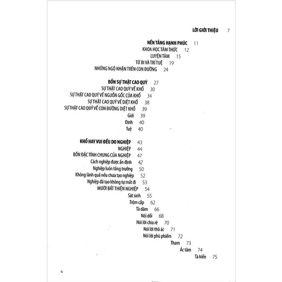 Cuốn sách mở đầu với những tiền đề căn bản, khẳng định đạo Phật là một môn khoa học về bản tâm con người, chứ không đơn thuần là một tôn giáo. Phần thứ hai trình bày bốn sự thật cao quý, là thành quả từ công trình chiêm nghiệm về kiếp nhân sinh của đức Phật trong suốt sáu năm ròng tu khổ hạnh và là nền tảng của toàn bộ lời Phật dạy, và kế tiếp là những chủ đề về thông điệp sống hạnh phúc, lòng từ bi và trí tuệ trong mỗi người.