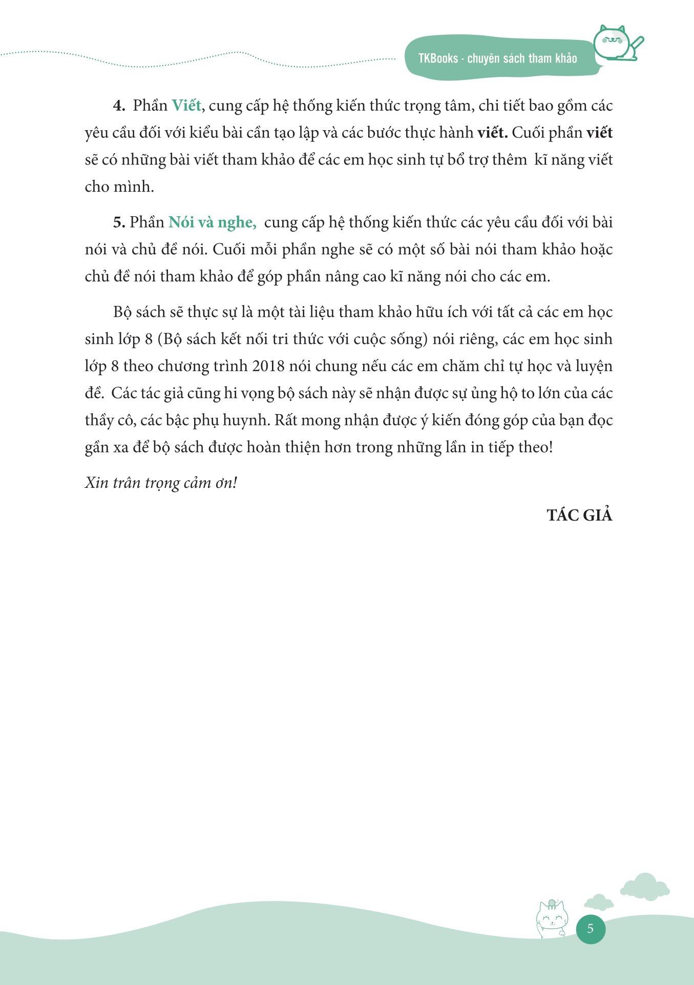 Phần Nói và nghe: Cung cấp hệ thống kiến thức các yêu cầu đối với bài nói và chủ đề nói, cuối phần sẽ có bài nói hoặc chủ để nói tham khảo để nâng cao kỹ năng nói cho học sinh.