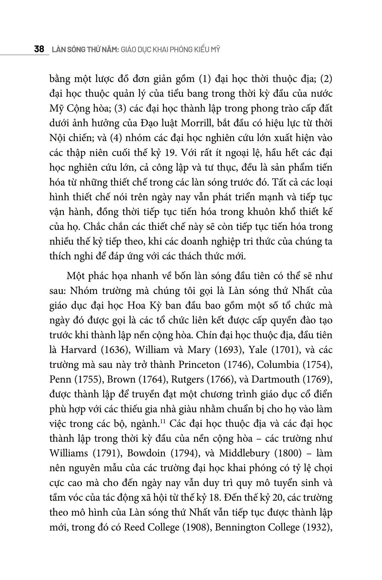 Làn Sóng Thứ Năm: Giáo Dục Khai Phóng Kiểu Mỹ Tái cấu trúc giáo dục đại học Hoa Kỳ Làn Sóng Thứ Năm: Giáo Dục Khai Phóng Kiểu Mỹ có thể được coi như một đề xuất tái cấu trúc giáo dục đại học Hoa Kỳ nói chung, dựa trên trường hợp thành công của Đại học Bang Arizona, và rộng hơn nữa là để tham khảo trong quá trình tái cấu trúc giáo dục đại học ở các nước trên thế giới, trong đó có Việt Nam, vốn đã có truyền thống hợp tác gần gũi, sâu rộng với ASU. Các tác giả của cuốn sách thực sự am hiểu sâu sắc về những gì nên và không nên làm trong giáo dục đại học: tận dụng mọi thế mạnh của sinh viên và hướng họ đến những vấn đề cấp bách nhất của thời đại. Trong The Fifth Wave: The Evolution of American Higher Education, Michael M. Crow và William B. Dabars lập luận rằng các trường cao đẳng và đại học cần được thiết kế lại toàn diện để có thể đào tạo càng nhiều sinh viên càng tốt và giữ nguyên chỉ tiêu tuyển sinh ngay cả khi thứ hạng của trường tăng lên (tức không tuyể sinh khắt khe hơn). Hai ông cho rằng chính sách tuyển sinh quá nghiêm ngặt của các trường như Harvard và Yale chỉ có nghĩa là họ đã chọn những sinh viên mà thành công sau này ít nhiều đã được bảo đảm, dù thế nào. Theo ông, việc đào tạo những sinh viên có khả năng và cơ hội thành công thấp hơn mới mang lại nhiều giá trị. Các nghiên cứu mới đây đã chứng minh ý kiến của ông là đúng. Làn Sóng Thứ Năm: Giáo Dục Khai Phóng Kiểu Mỹ - Làn sóng của tri thức và công nghệ Về mặt tên gọi, Crow và Dabars phân chia lịch sử giáo dục đại học Hoa Kỳ thành các làn sóng nối tiếp nhau từ các trường thời lập quốc (Làn sóng thứ Nhất) cho đến các trường đại học nghiên cứu (Làn sóng thứ Tư), và Làn sóng thứ Năm đang dần hình thành sẽ bao gồm một liên minh các trường cao đẳng và đại học có mong muốn mang lại tác động tích cực cho xã hội thông qua sự tích hợp liền mạch giữa sản xuất tri thức đẳng cấp thế giới và đổi mới công nghệ. Các trường thuộc Làn sóng thứ Năm như Đại học Bang Arizona đã bắt đầu mở rộng mạng lưới bao gồm học viện, doanh nghiệp, các cơ quan chính phủ, phòng thí nghiệm và các tổ chức xã hội dân sự. Tập hợp các thiết chế này ưu tiên tiếp cận nhóm nhân khẩu học rộng nhất có thể, đại diện cho các thành phần kinh tế xã hội và trí tuệ đa dạng trong xã hội. Ý tưởng về Làn sóng thứ Năm thực sự rất tuyệt vời. Với các dữ liệu phong phú và sự thật thú vị về các trường đại học, được đúc kết từ nhiều lĩnh vực khác nhau từ thiết kế, kinh tế, chính sách công, lý thuyết tổ chức, nghiên cứu khoa học và công nghệ, xã hội học, tâm lý học và thậm chí nhận thức luận, các tác giả đã trình bày một chủ đề quan trọng, đầy hứa hẹn và tôi tin rằng với bất kỳ ai quan tâm đến tương lai của giáo dục đại học đều không nên bỏ qua Làn sóng thứ Năm: Giáo Dục Khai Phóng Kiểu Mỹ.