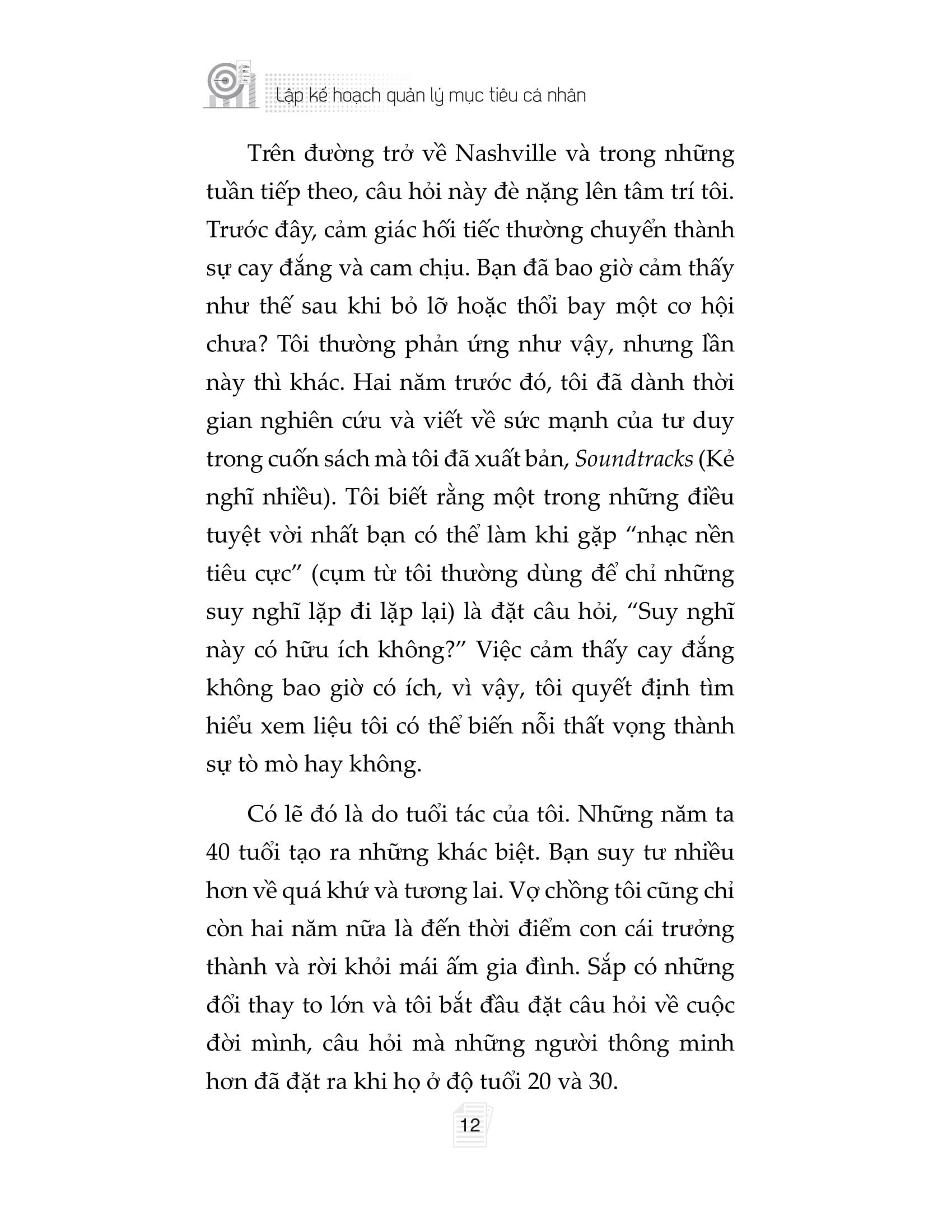 Lập Kế Hoạch Quản Lý Mục Tiêu Cá Nhân Để có được một sự nghiệp vững chắc, bạn cần phải làm gì? Muốn có một cuộc hôn nhân thuận lợi bạn cần phải có gì? Bạn cần phải rèn luyện như thế nào để có một sức khỏe tốt? Để có thể thực hiện được những câu hỏi trên, chắc chắn bạn phải thiết lập được mục tiêu của chính m.ình. Sống có mục tiêu là động lực để bạn không ngừng phát triển, tạo nên nhiều giá trị và có cuộc sống hạnh phúc hơn. Đây là chìa khóa cho sự phát triển cá nhân của chúng ta và đạt được ước mơ của chúng ta. Nó giúp chúng ta đi trên một con đường tiến bộ, có tổ chức với các bước hữu hình dễ quản lý và xem xét. Nếu không thiết lập mục tiêu, bạn có thể thấy m.ình đang mò mẫm trong bóng tối, và mọi chuyện trở nên bế tắc. Cuốn sách “Lập kế hoạch quản lý mục tiêu cá nhân” viết ra nhằm hướng dẫn bạn cách thiết lập mục tiêu theo ba cấp độ để khai phá trọn vẹn tiềm năng của chính m.ình trong mọi khía cạnh cuộc sống (sự nghiệp, tài chính, mối quan hệ, sức khỏe và niềm vui). Với việc thiết lập mục tiêu hợp lý và có kế hoạch theo dõi tiến độ rõ ràng, bất kỳ ai áp dụng phương pháp của Jon Acuff cũng có thể duy trì năng lượng và động lực vô tận để vươn tới những mục tiêu to lớn, dài hạn và giàu ý nghĩa. Với ba cấp độ mục tiêu (mục tiêu dễ dàng, mục tiêu trung bình và mục tiêu đảm bảo sẽ đạt được), tác giả vạch ra một con đường rõ ràng để ta kéo bản thân m.ình ra khỏi Vùng thoải mái trì trệ, tránh xa Vùng hỗn loạn luôn căng thẳng, để có thể tận hưởng những khoảnh khắc tuyệt vời trong Vùng tiềm năng. Đặc biệt, bằng việc cung cấp các công cụ dễ áp dụng và hàng chục ví dụ thực tế về những con người thật, những câu chuyện thật, Jon Acuff không chỉ hướng dẫn ta cách bước vào Vùng tiềm năng, mà còn là sống lâu dài ở đó một cách bền bỉ, vui vẻ và đầy hứng khởi. Về tác giả Jon Acuff được tạp chí ine vinh danh là 1 trong 100 diễn giả về quản lý, lãnh đạo nổi bật. Ông đã diễn thuyết ở nhiều quốc gia trên thế giới cho các tập đoàn lớn như Microsoft, Nissan, Walmart, Fed Ex và Comedy Central. Anh là tác giả của chín cuốn sách bán chạy nhất theo bình chọn của New York Times, trong đó có Soundtracks: The Surprising Solution to Overthinking (tạm dịch: Soundtrack: Nghĩ tối giản).