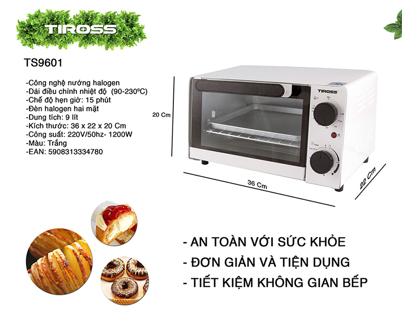 Thông tin sản phẩm Đặc điểm nổi bật của lò nướng Tiross TS9608 28 lít Về thiết kế Lò nướng điện trang bị màn hình LCD với cửa mở ở 3 cấp độ. Chân đế lò vững chắc, tránh ăn mòn. 2 bên lò có khe tản nhiệt giúp lò bền bỉ hơn. Dung tích 28 lít Với dung tích 28 lít, lò nướng Tiross TS9608 có thể nướng được 6 lát bánh mì và 1 chiếc pizza đường kính 30cm. Tiện ích Chế độ kiểm soát nhiệt điện trở, dễ dàng điều chỉnh nhiệt độ từ 66 - 232 độ C. Lò có chức năng hẹn giờ 60 phút và có chuông báo khi kết thúc. Về thanh nhiệt Thanh nhiệt trên dưới giúp nhiệt tản đều, nướng thực phẩm thêm ngon hơn. Thanh nhiệt làm từ kim loại, nhiệt nướng cao, giảm mỡ chất béo, ăn tốt cho sức khỏe. Lò thiết kế 2 vị trí giá nướng, tự chọn theo ý thích. Người dùng có thể nướng 1 mặt hoặc nhiều mặt. Người dùng có thể nướng bằng khay và nướng bằng giá đồng thời sử dụng. Dễ sử dụng Lò nướng Tiross thiết kế bảng điều khiển dạng nút nhấn và 2 núm vặn cơ: - Nút bắt đầu/tạm dừng - Nút quay - Nút đối lưu - Núm chọn chức năng - Nút cài đặt hẹn giờ/nhiệt độ