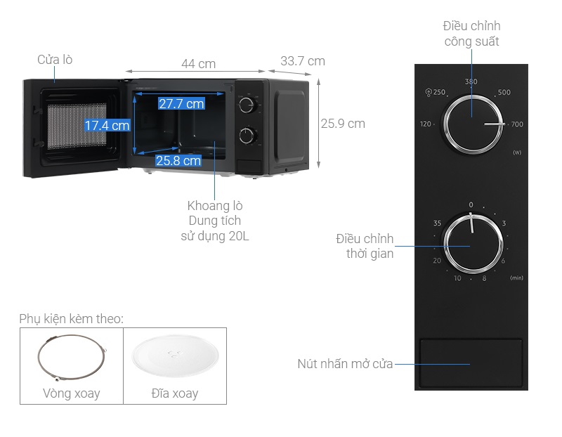 [THÔNG SỐ KỸ THUẬT] Dung lượng: 20L (0.7 Cu.ft) Tiêu thụ điện (Lò vi sóng): 1050 W Kích thước bên ngoài (RxCxS): 440 x 259 x 337.5 mm Thiết kế Màu sắc: Đen