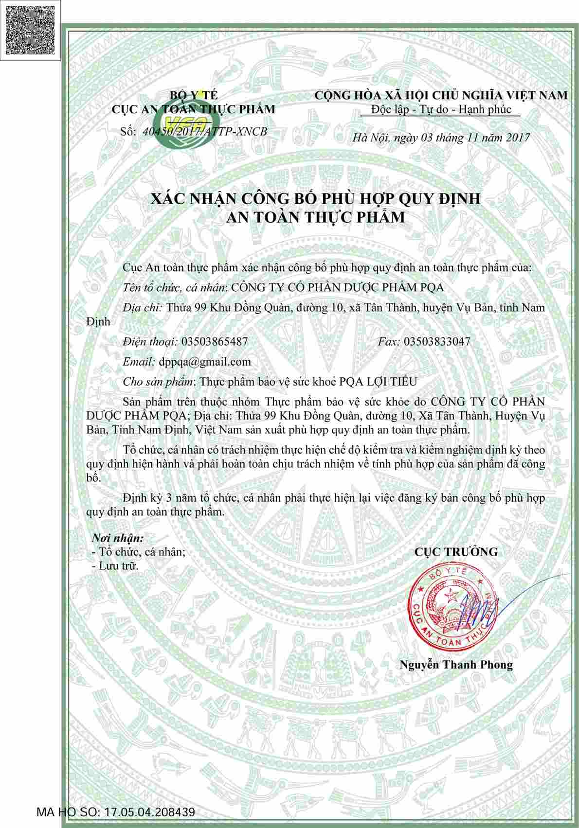 - Địa chỉ sản xuất: Công ty Cổ phần Dược phẩm PQA. Thửa 99, Khu Đồng Quàn, Xã Tân Thành, Huyện Vụ Bản, Tỉnh Nam Định. THÀNH PHẦN: