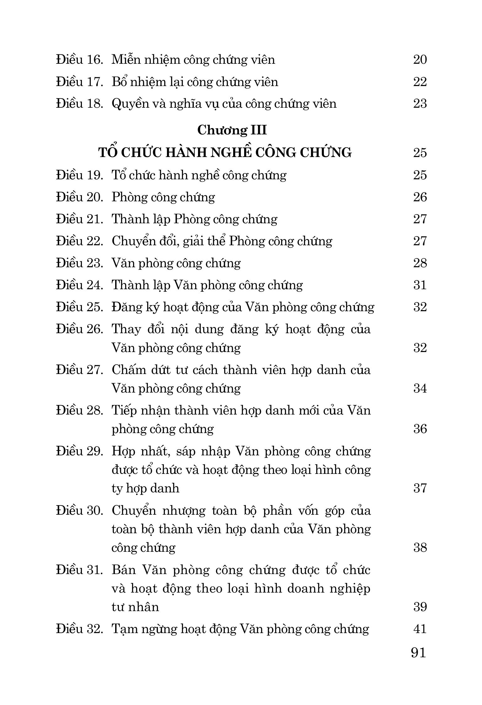 Luật Công chứng 2024 Tác giả: Quốc Hội Nhà xuất bản: Lao Động Công ty phát hành: Dân Hiền Ngày phát hành: 1.2025 Số trang: 96 Khổ sách: 13*19 cm Giá bìa: 26.000 đ Luật Công chứng 2024 (Luật số: 46/2024/QH15) được Quốc hội khóa XV thông qua vào ngày 20/6/2024 và có hiệu lực từ ngày 1/7/2025. Luật gồm 8 chương và 76 điều, thay thế cho Luật Công chứng 2014, với nhiều điểm mới nhằm cải thiện tính minh bạch, hiệu quả và hiện đại hóa trong lĩnh vực công chứng. Điểm mới quy định về Tổ chức hành nghề công chứng tại Luật Công chứng 2024, cụ thể là Về Phòng công chứng: Được sửa đổi, bổ sung theo hướng giao cho Giám đốc Sở Tư pháp bổ nhiệm, miễn nhiệm, cách chức Trưởng PCC thay vì giao cho Chủ tịch Ủy ban nhân dân (UBND) cấp tỉnh như hiện nay để tăng cường phân cấp, phân quyền trong công tác quản lý nhà nước về công chứng. Cụ thể tại khoản 3 Điều 20 Luật Công chứng 2024 có quy định như sau: Người đại diện theo pháp luật của Phòng công chứng là Trưởng Phòng công chứng, do Giám đốc Sở Tư pháp bổ nhiệm, miễn nhiệm, cách chức theo quy định của pháp luật. Trưởng Phòng công chứng phải là công chứng viên và đã hành nghề công chứng từ đủ 02 năm trở lên. Đồng thời điều kiện thành lập phòng công chứng theo Luật Công chứng 2024 như sau: