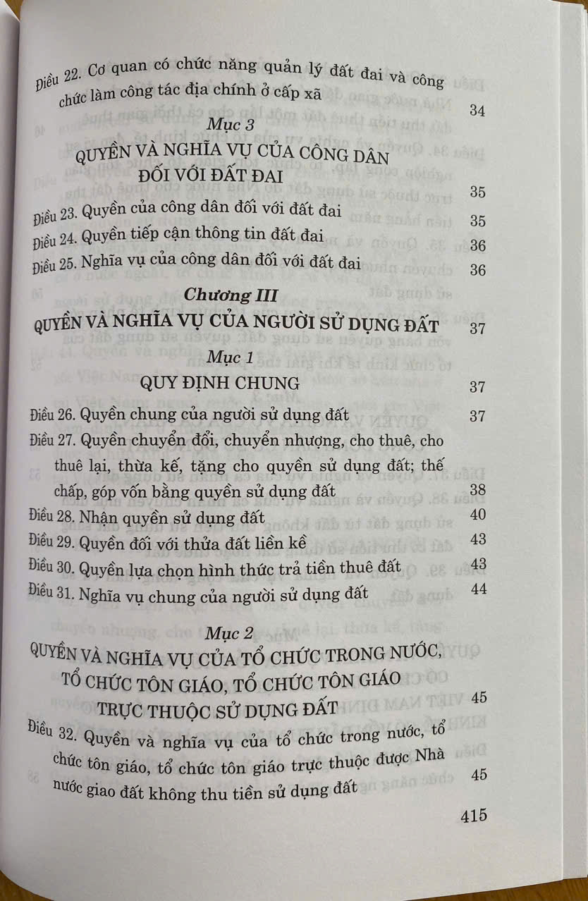 Luật Đất đai số 31/2024/QH15 được Quốc hội khóa XV thông qua ngày 18/01/2024. Luật Đất đai năm 2024 gồm 16 chương, 260 điều, trong đó sửa đổi, bổ sung 180 điều của Luật