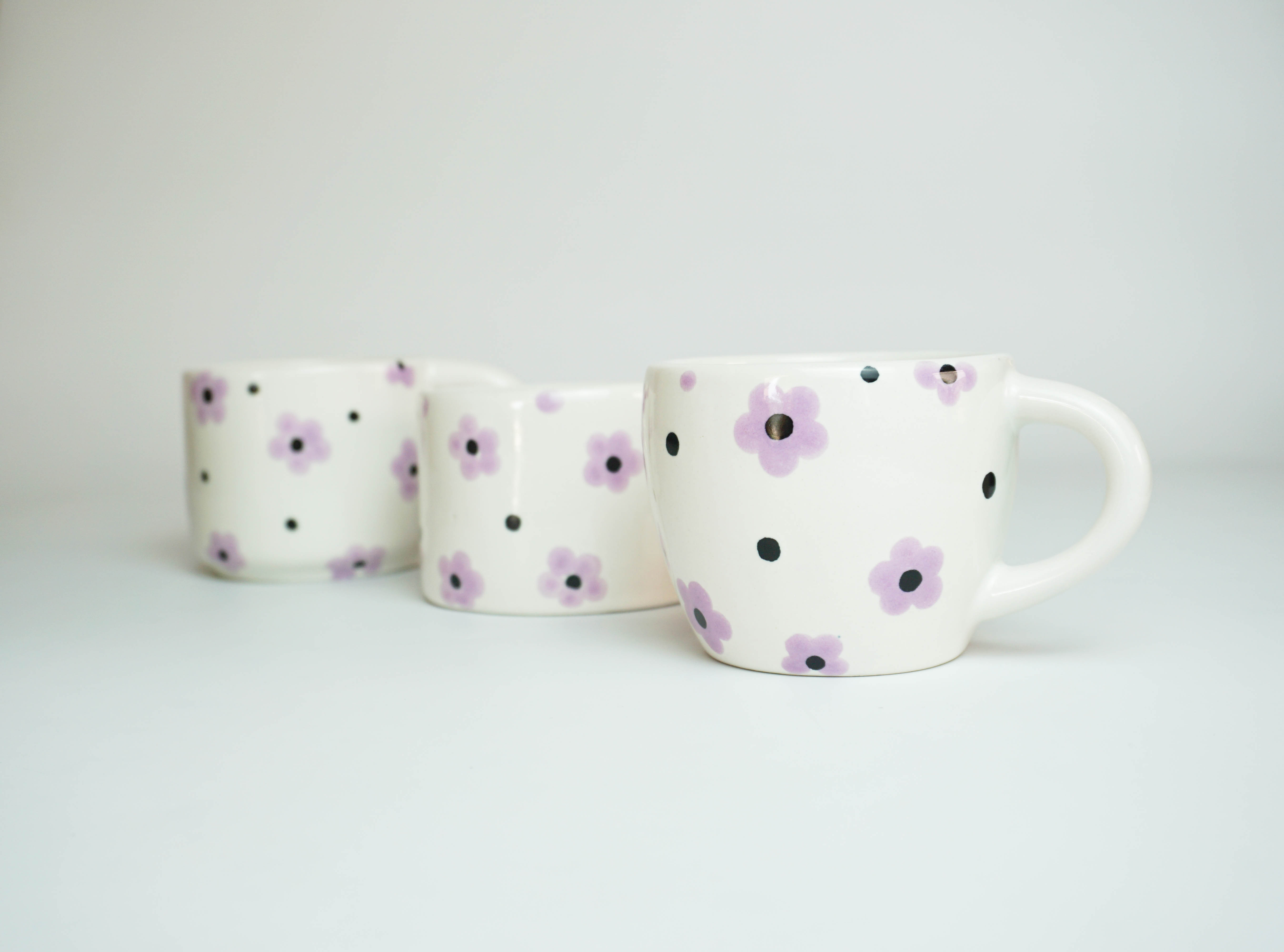 Bộ sưu tập Li Ti của thương hiệu Lina Pottery by Minh Tien Ceramic với men lớp men bóng và họa tiết đẹp mắt bao gồm ly Morning (trung, lớn và đại) và dĩa tròn đi kèm.