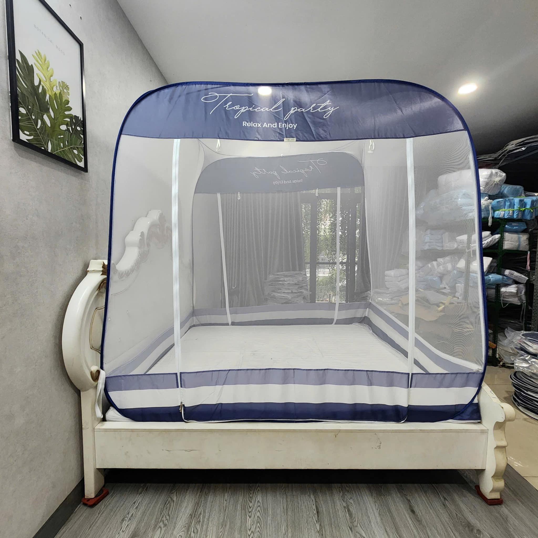 Kiểu dáng: Đỉnh rộng, có 2 cửa ra vào,  có viền chân là từ vải nylon thay vì lưới mùng ( giúp bảo vệ 100% khi để tay chân chạm sát mùng)