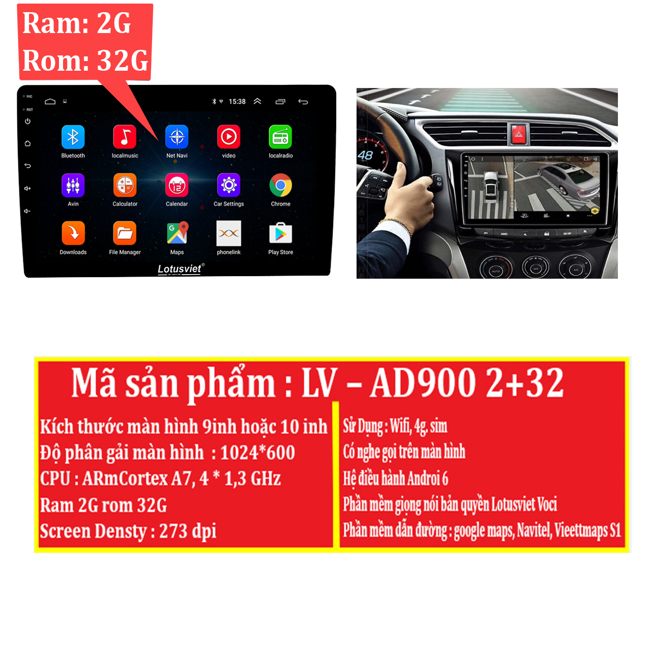 • Screen Densty : 273 dpi - Sử Dụng : Wifi, 4g. sim - Có nghe gọi trên màn hình - Hệ điều hành Androi 6 - Phần mềm giọng nói bản quyền Lotusviet Voci - Phần mềm dẫn đường : google maps, Navitel, Viettmaps S1