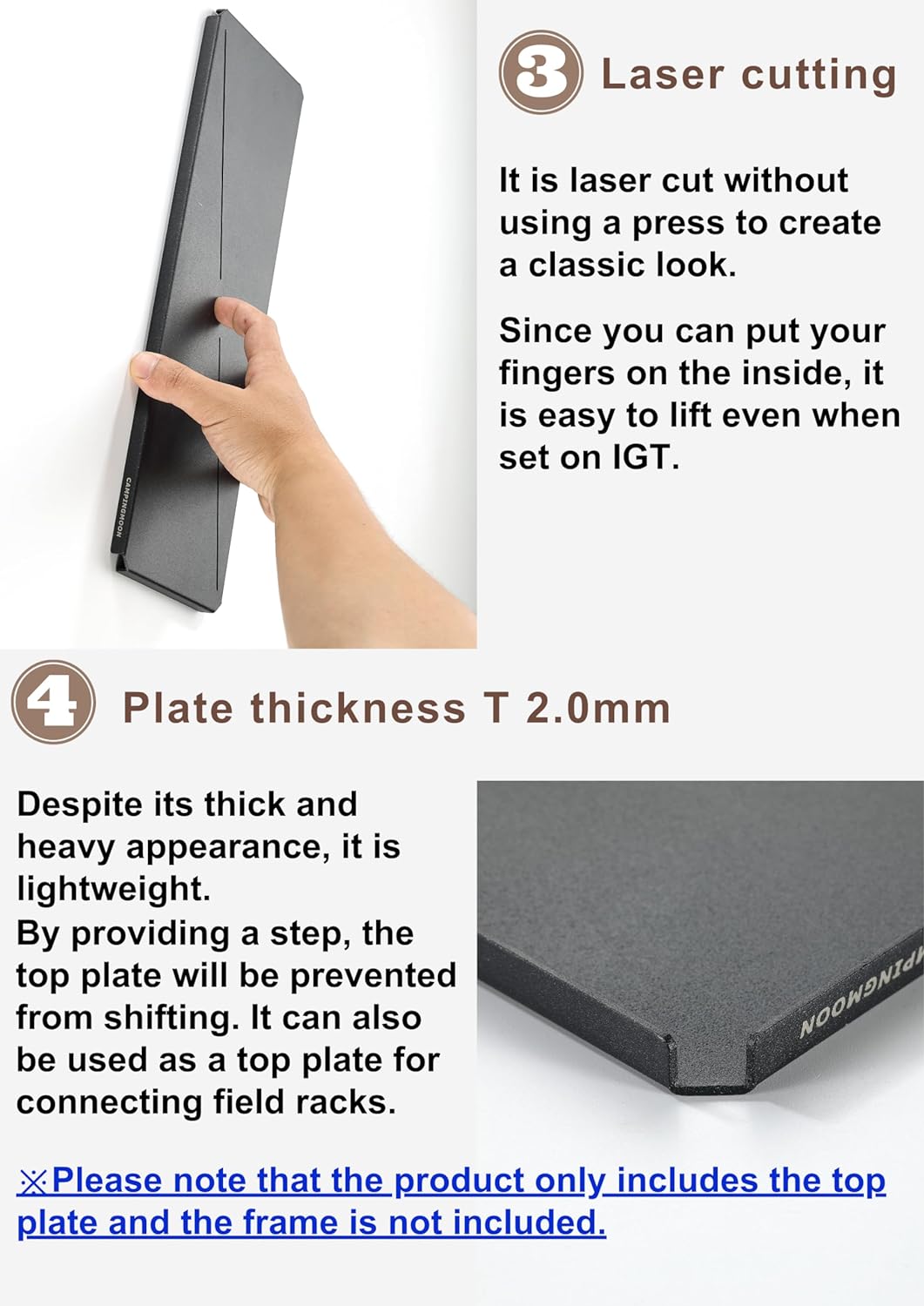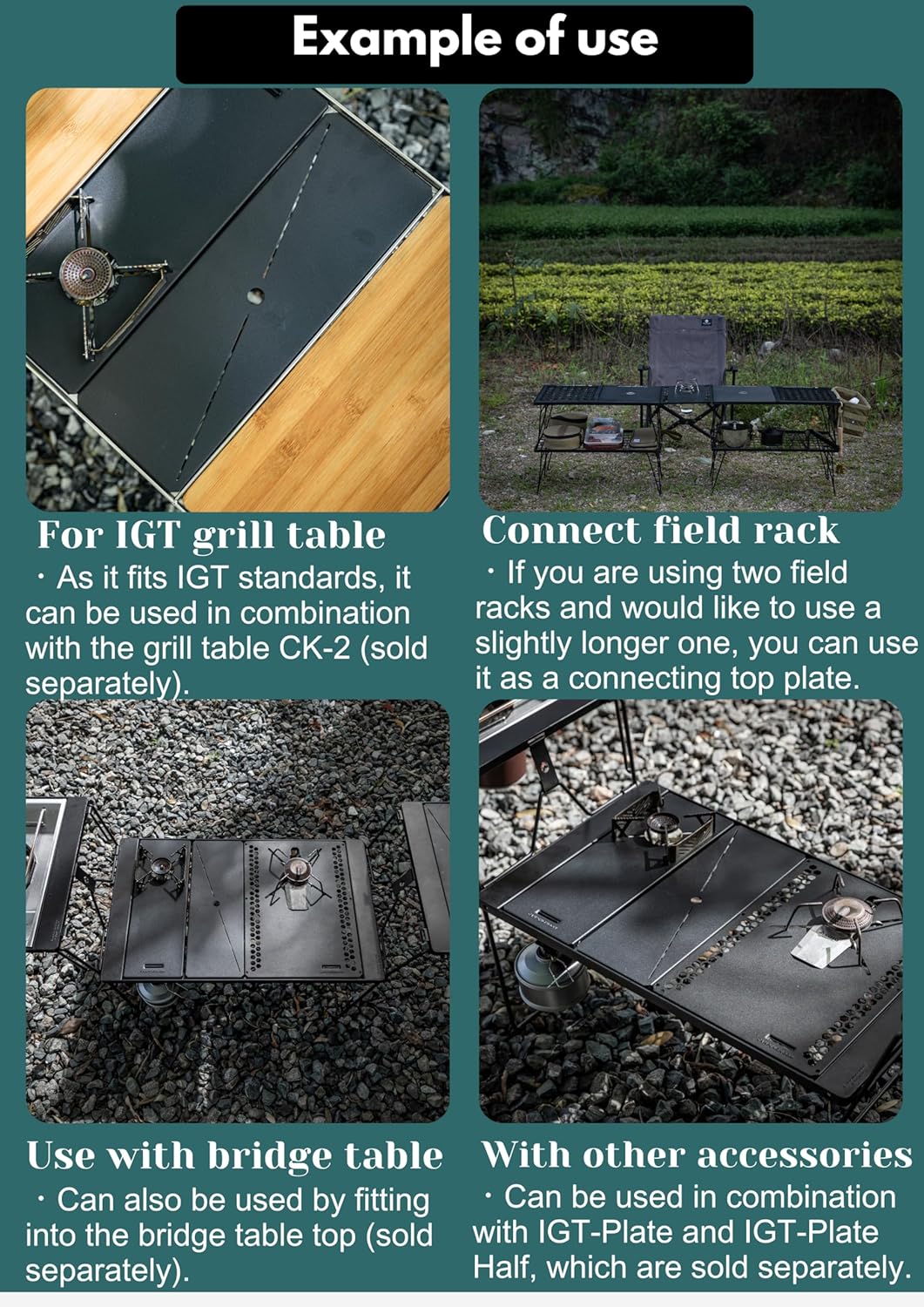 Mặt bàn nhôm một phần hai Campingmoon IGT CK-12BK-2P được khắc bằng laser có thể sử dụng trên bàn nướng, kệ CK-2, khung bàn IGT Campingmoon CK-3650-T38. Hai tấm nhôm này tương đương với một đơn vị tiêu chuẩn IGT nên cũng có thể được sử dụng để lấp đầy khoảng trống của các sản phẩm kệ sắt (IGT) khác.