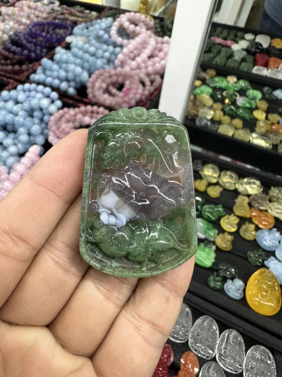 Hợp tất cả các mệnh Chất liệu: Đá ngọc băng tảo Kích thước: Cao 4,8 cm x Dài 3,3 cm Tặng kèm dây đeo