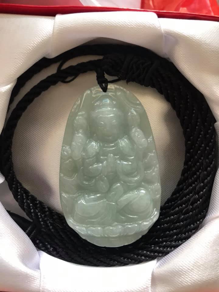 Mặt Phật Bà đứng Cẩm Thạch xanh trắng lí - Chất liệu: Ngọc Cẩm Thạch tự nhiên. - Màu sắc: Xanh lí phớt trắng - Kích thước: ngang 49mm, cao 23mm, dày 4mmx8mm - Mã kiểm định: 86691 - Tiêu chuẩn