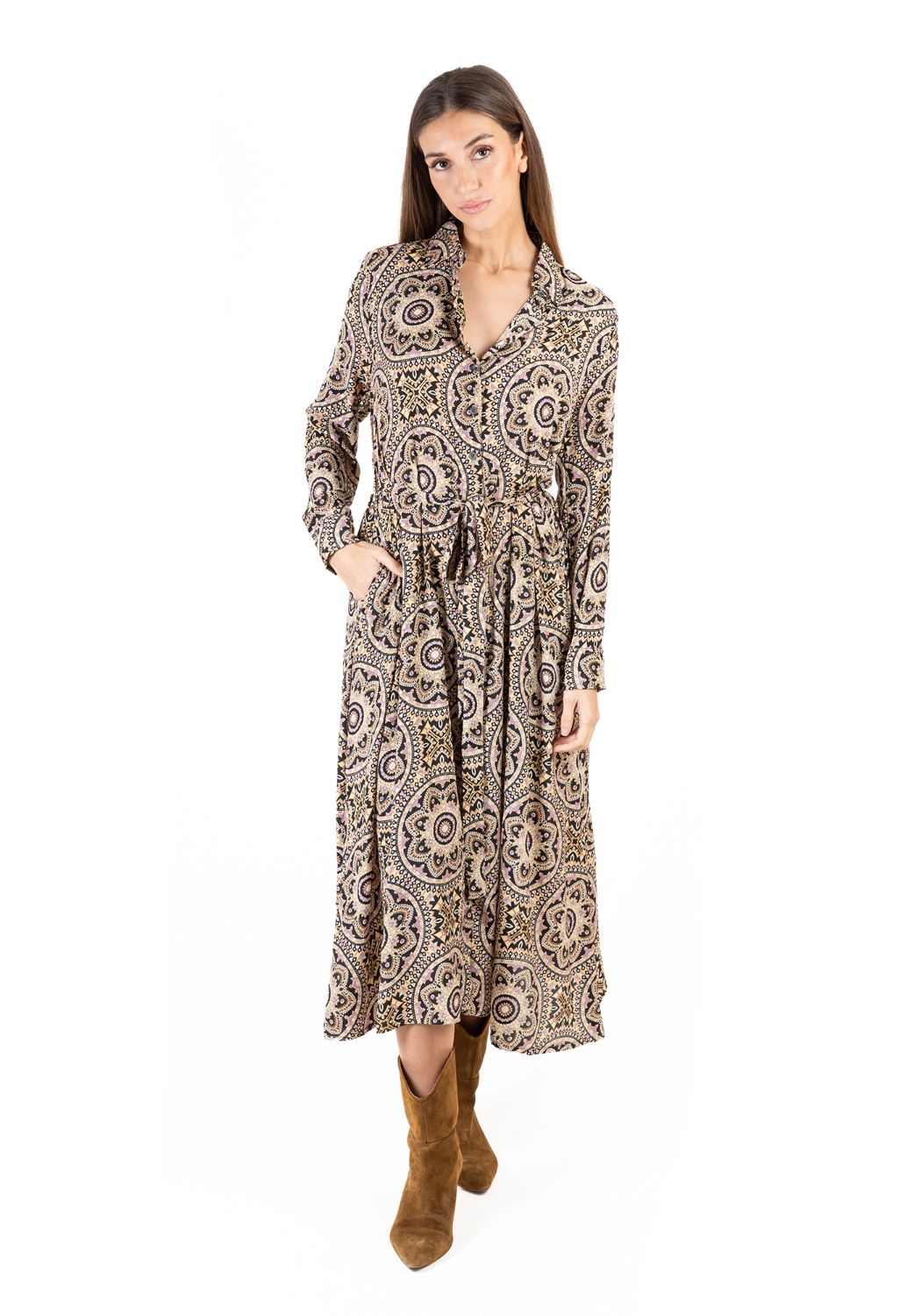 Maxi Sơ Mi Dài Tay Isla Bonita, chất lụa mềm mại, cao cấp. Có dây cột eo. Phom suông. Dài đầm 126cm (45x126) Phù hợp đi biển, dạo phố, công sở, hoặc dự tiệc. Hướng