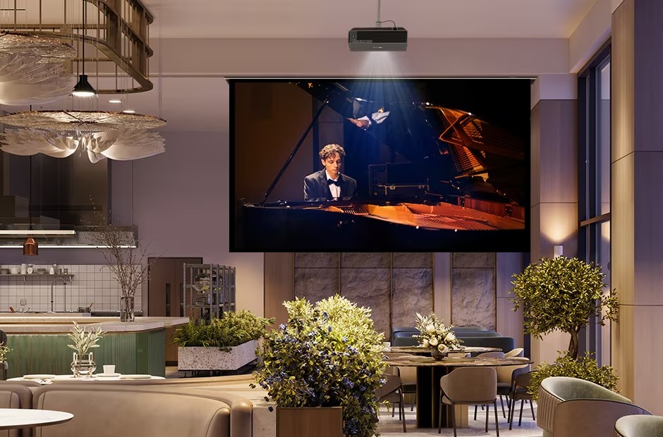 Máy chiếu Samsung LSP7T có độ phân giải thực 4K UHD 3840 x 2160 pixels cho hình ảnh sắc nét đáng kinh ngạc, công nghệ nguồn sáng sử dụng nguồn sáng laser cho hiệu quả