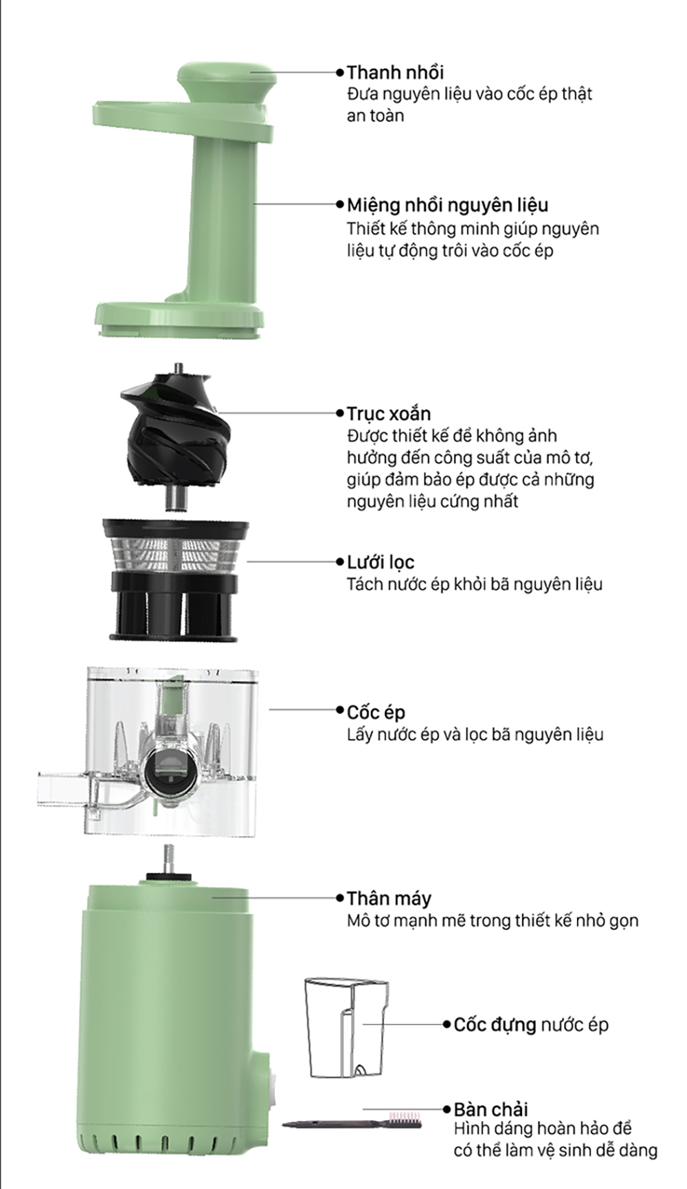 Ưu điểm nổi trội của máy ép chậm so với máy ép trái cây thông thường - Đường kính lớn 7.8cm, không cần cắt nhỏ, ép trực tiếp - Tỷ lệ nước ép nguyên chất
