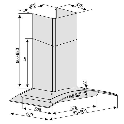 Chất liệu Inox-Kính Điều khiển cảm ứng điện tử + Hẹn giờ Màn hình hiển thị LCD Ống thoát Ø 150mm Đèn Led tiết kiệm điện:4x1.5W Bộ lọc than hoạt tính và lưới lọc Inox
