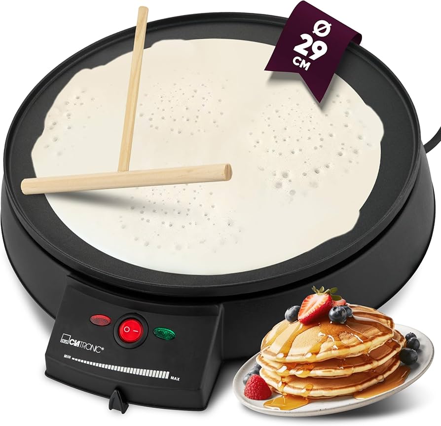 Bánh kếp mỏng như giấy, được chuẩn bị nhanh chóng và dễ dàng Tấm gia nhiệt: Ø 29 cm Lớp phủ chống dính Bộ điều chỉnh nhiệt có thể điều chỉnh liên tục Đèn nấu Đế nhựa cách điện Giắc cắm cáp trên đế Bao gồm bộ phận định lượng bột Nguồn điện: 230 V, 50 Hz Công suất tiêu thụ: 900 W