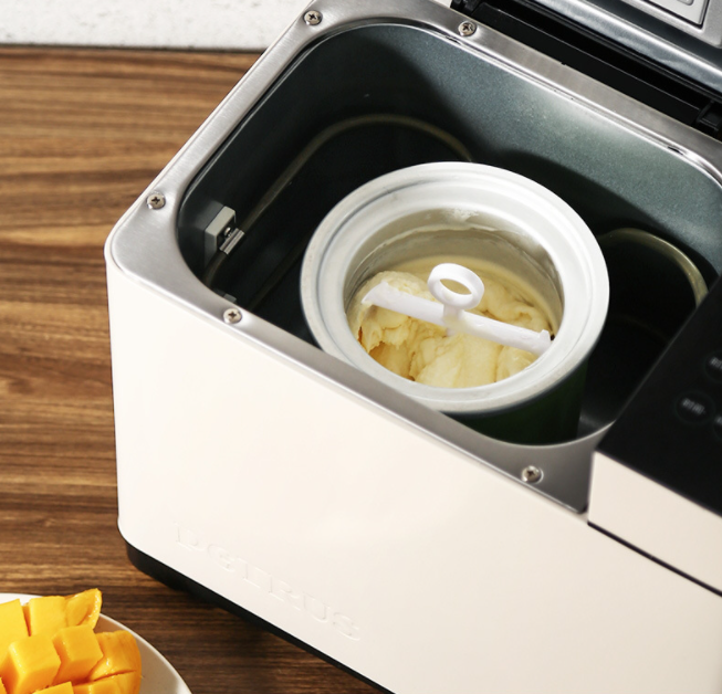 Làm kem bằng âu riêng, làm lạnh âu kem trong 12h, rồi xay nguyên liệu đưa vào bật chế độ trôn trong 30 phút là có kem (Âu kem không đi kèm cùng hộp). Đặc điểm nổi bật của máy làm bánh mỳ tự động Petrus PE9600VN