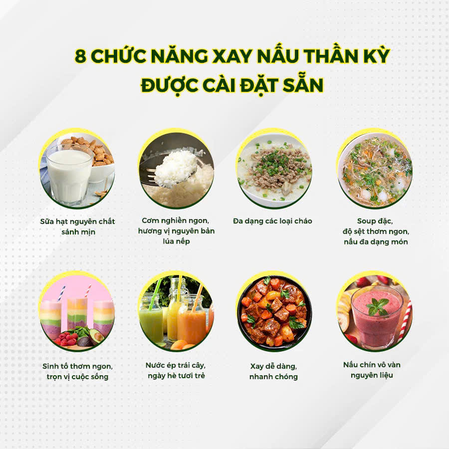 - TRANG BỊ 8 CHỨC NĂNG XAY NẤU ĐƯỢC CÀI ĐẶT SẴN