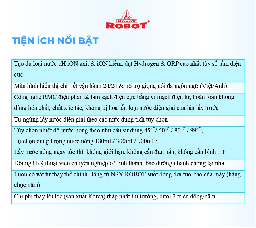 ️ Với mong muốn nhiều gia đình Việt có thể sử dụng nước điện giải iON kiềm với chi phí hợp lý để bảo vệ sức khỏe, sắc đẹp & nâng cao chất lượng cuộc sống, ROBOT mang đến sản phẩm “Chất lượng Quốc tế - Giá thành Việt Nam”, phù hợp với mức sống của nhiều người. Tiết kiệm cho người tiêu dùng đến hơn một nửa chí phí so với máy nhập khẩu chỉ từ 30 – 50%, nhưng sở hữu nhiều ưu điểm, tính năng vượt trội, chất lượng cao.