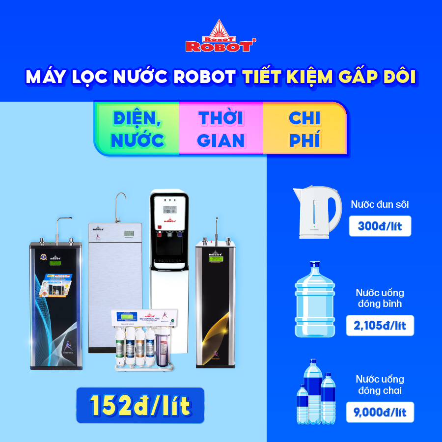 - Sử dụng Máy lọc nước ROBOT giúp TIẾT KIỆM rất lớn chi phí sử dụng bình nước 20 lít, cũng như không tốn điện & thời gian khi phải đun sôi nước để uống. Hiệu quả kinh tế tối đa, thời gian thu hồi vốn chỉ từ 6 tháng đến 1 năm.