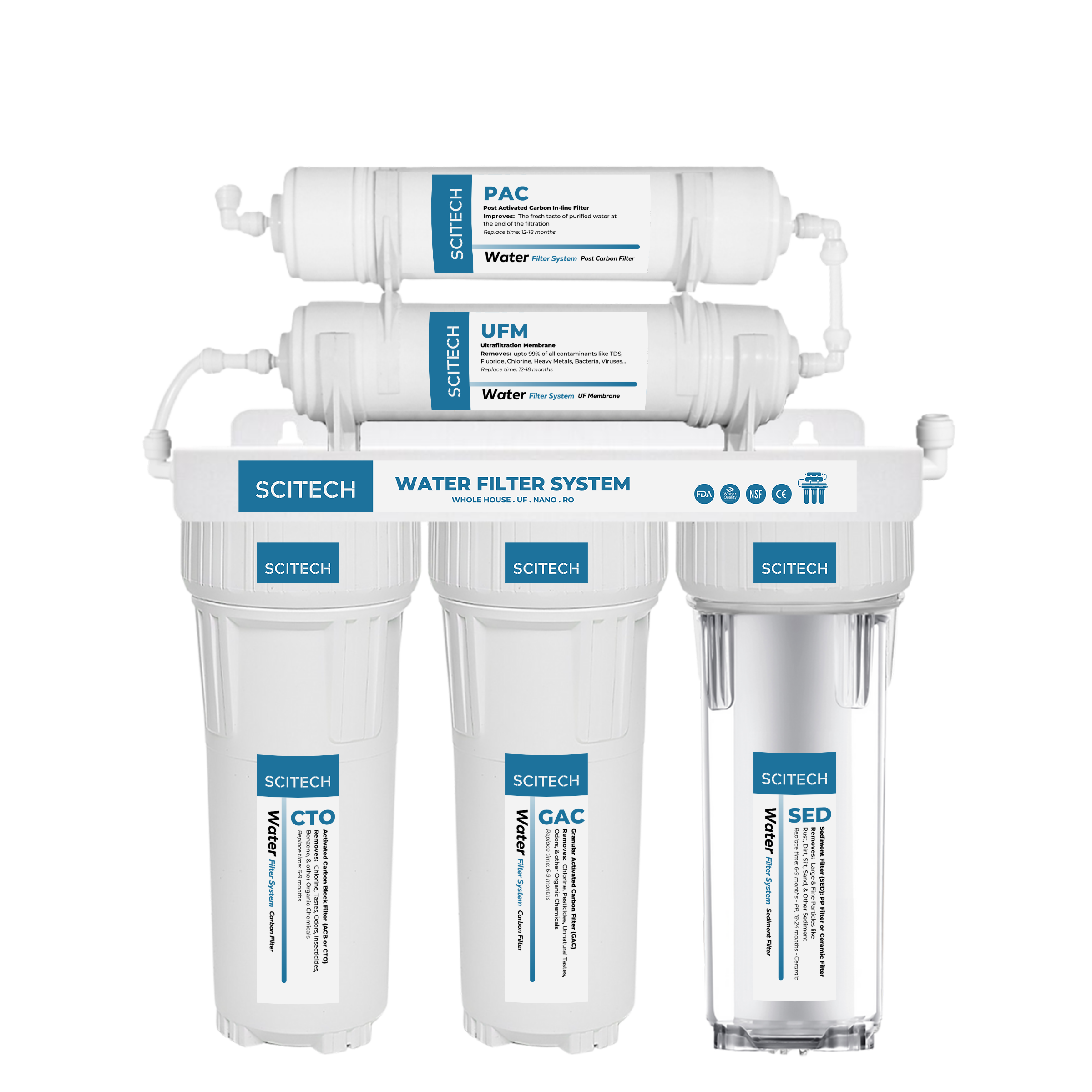 Máy lọc nước UF Scitech Ultrabox 4-5 cấp lọc giúp lọc sạch cặn bẩn, rỉ sét, rong rêu, chất hữu cơ và các tạp chất khác lẫn trong nước. Bộ lọc thích hợp dùng lọc