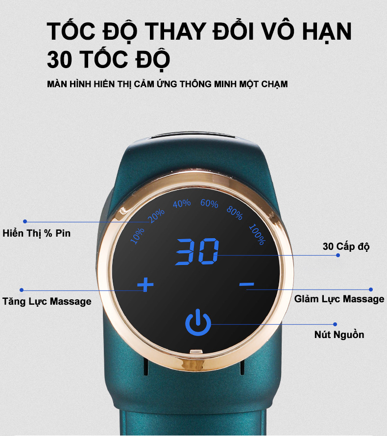 trang bị 30 mức tốc độ massage tùy chỉnh theo nhu cầu của người dùng. Công suất và tuần số nhịp đấm thay đổi theo từng mức độ massage mà bạn chọn. Nên đảm bảo an toàn cho sức khỏe người dùng và giúp cho hiệu quả massage được tối ưu.