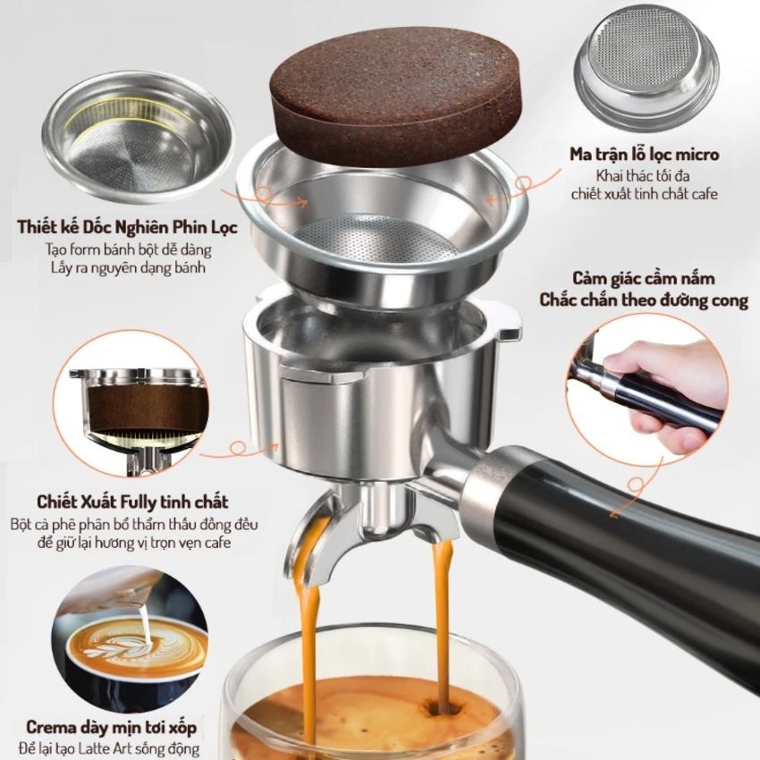 - Bộ phụ kiện bao gồm: 1 thân máy, 3 phin lọc inox, 1 tay cầm tiêu chuẩn 51mm, 1 thìa múc kiêm nén, 1 sách HDSD