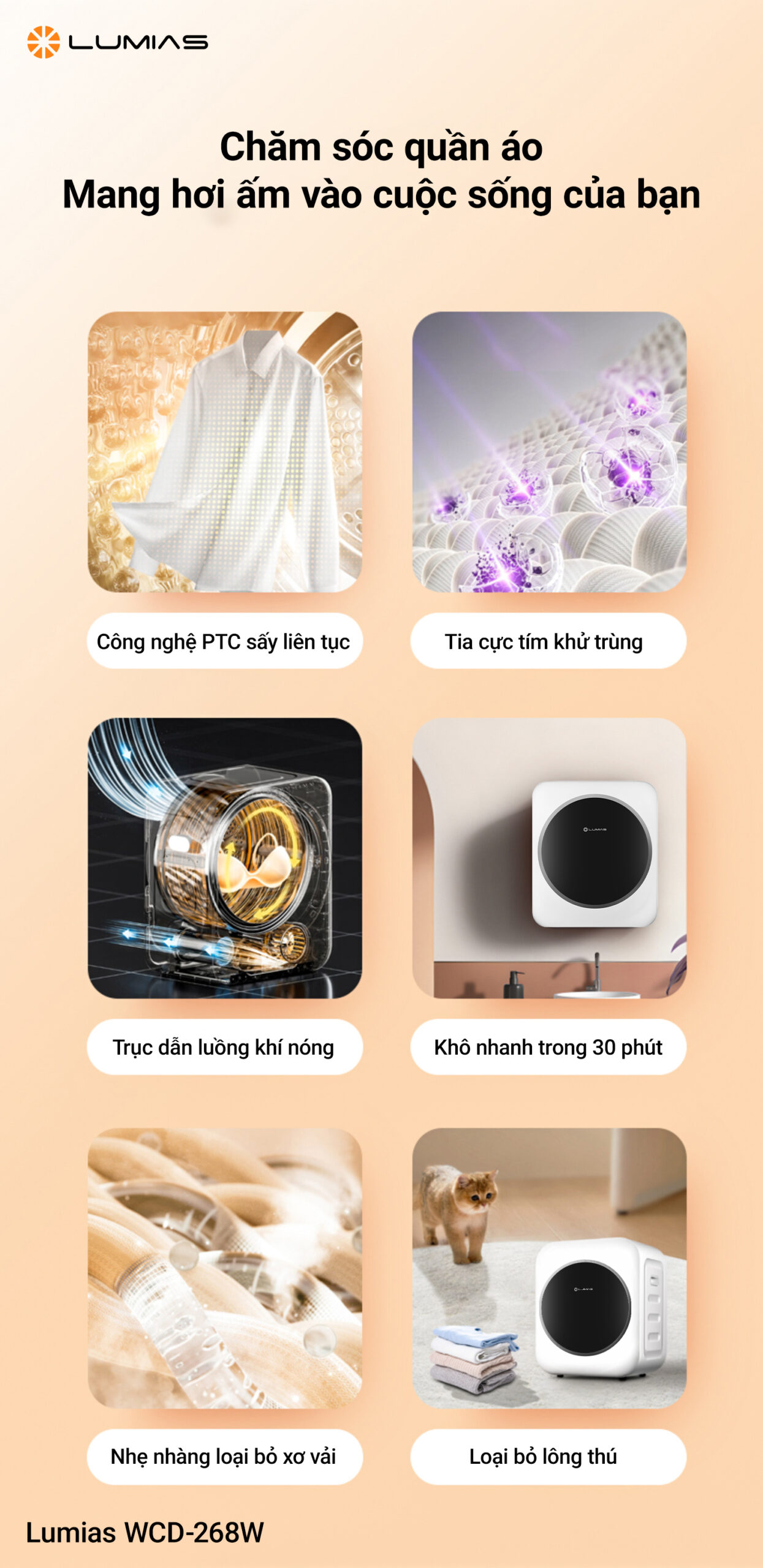 Tên sản phẩm Máy sấy quần áo Lumias WCD-268W Model WCD-268W Công suất tiêu thụ 800W Nguồn điện 220-240V/50-60Hz Công nghệ sấy PTC Tiện ích Khử trùng bằng tia cực tím 360° Sấy khô nhanh