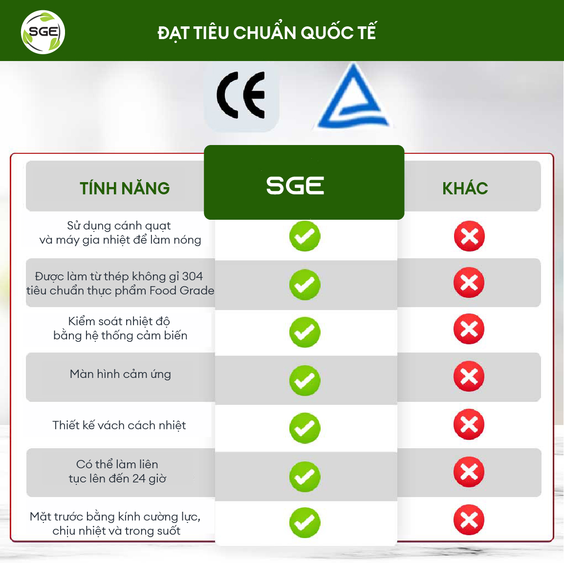 Tủ sấy thực phẩm GE-Black của SGE được thiết kế và phát triển liên tục. Phiên bản đặc biệt GE-Black dành cho hộ gia đình và nhà hàng hàng cao cấp với thân hình nhỏ gọn, tiết kiệm điện nhưng hiệu suất làm việc vẫn không đổi và có thể làm liên tục lên đến 24 giờ.