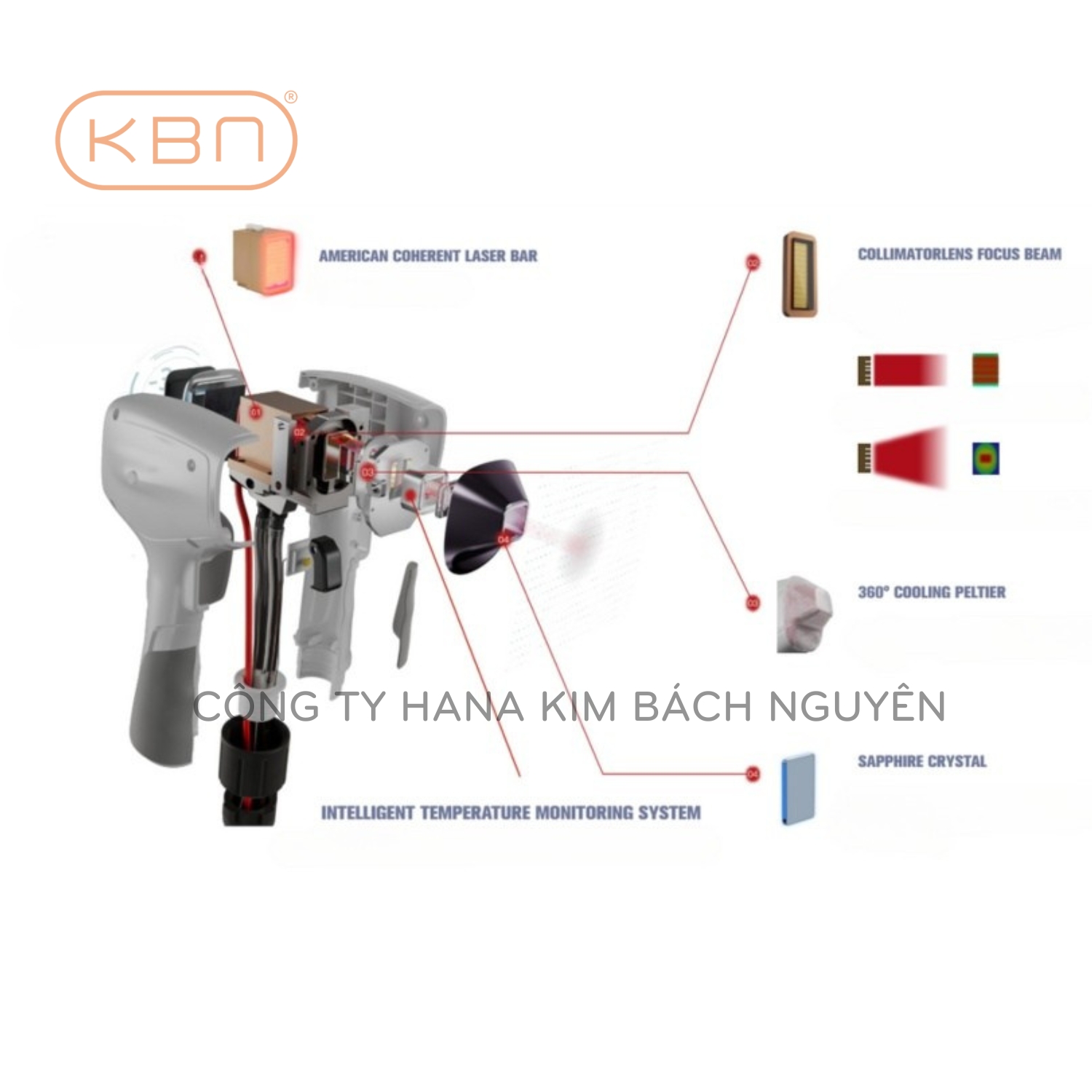 - Cấu tạo tay cầm & công nghệ hỗ trợ Thanh laser COHERENT (Mỹ) – tuổi thọ lên tới 100 triệu xung. Thấu kính Collimator – giúp tia laser hội tụ chính xác. Hệ thống làm mát Peltier 360° – làm lạnh bề mặt xuống đến -30°C, bảo vệ da tối ưu. Tinh thể Sapphire – truyền ánh sáng tốt, tăng hiệu quả. Màn hình OLED cảm ứng 1.54 inch trên tay cầm – điều chỉnh năng lượng, xung, nhiệt độ trực tiếp.