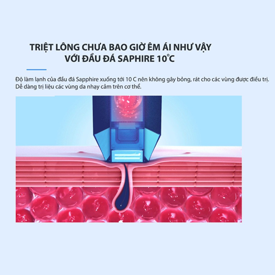 • Khôi phục liên kết Collagen và Elastin xóa các gốc melanin hỗ trợ mờ thâm nám, làm đầy nếp nhăn. Đầu bổ sung 1cm2 tối ưu cho những vùng nhỏ. Thiết kế chuyên biệt cho việc triệt các vùng nhỏ lông mày, ria mép, ngón tay, ngón chân, và các vùng nhạy cảm khác. Đầu hít nam châm nên rất dễ dàng cho việc lắp ráp. Sáu mức năng lượng cho từng vùng triệt. Thiết kế không dây di chuyển thuận lợi Những thiết bị lỗi thời phụ thuộc vào dây nguồn cắm vào nguồn điện mới chạy. Máy triệt lông này khách hàng sạc đầy pin có thể triệt được toàn thân và sử dụng nhều lần cho các vùng nhỏ. Vòng đời vĩnh viễn với 300.000 xung đầu tiên giá trị năng lượng không bị thay đổi, máy đảm bảo hiệu quả không bị suy giảm theo thời gian như các máy khác trên thị trường. Dễ dàng chuyển đổi dễ dàng giữ 2 chế độ thủ công và tự động.