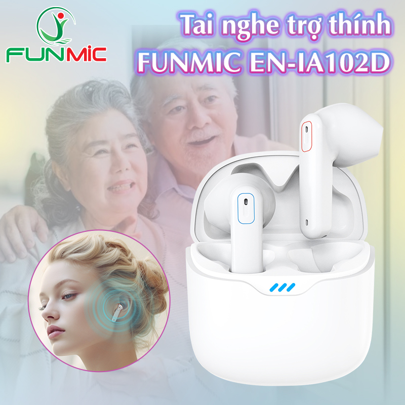 Máy trợ thính Funmic EN-IA102D - Kết nối Bluetooth Máy trợ thính Funmic EN-IA102D phù hợp cho người lớn bị mất thính lực từ nhẹ đến trung bình. Máy hỗ trợ người dùng trong các cuộc trò chuyện hàng ngày, xem ti vi, nghe điện thoại.. rõ ràng 90-95% như người thường. Máy nhỏ gọn tinh tế tính thẩm mỹ cao, sạc pin tiện dụng, chất âm tốt... nên được nhiều người yêu thích. Sản phẩm là lựa chọn hoàn hảo cho những ai cần cải thiện khả năng nghe mà vẫn muốn giữ sự tiện lợi và thẩm mỹ cao. Đặc điểm nổi bật máy trợ thính Funmic EN-IA102D: