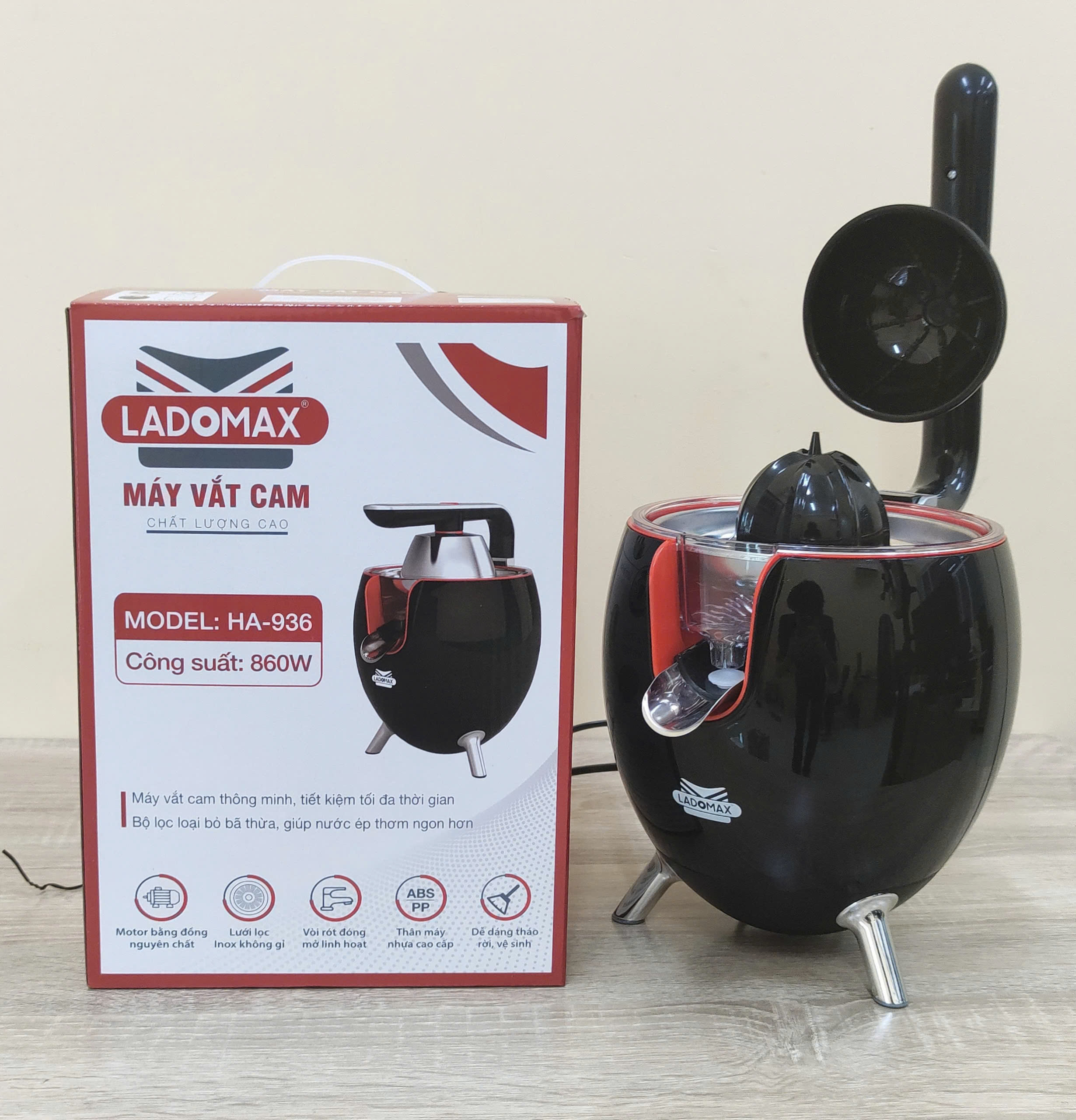 Thông tin sản phẩm Thương hiệu Ladomax chính hãng Máy: Máy vắt cam công nghiệp Công suât: 860W Model : 936 màu đen Điện áp: 220-240V, 50/60HZ Bảo hành