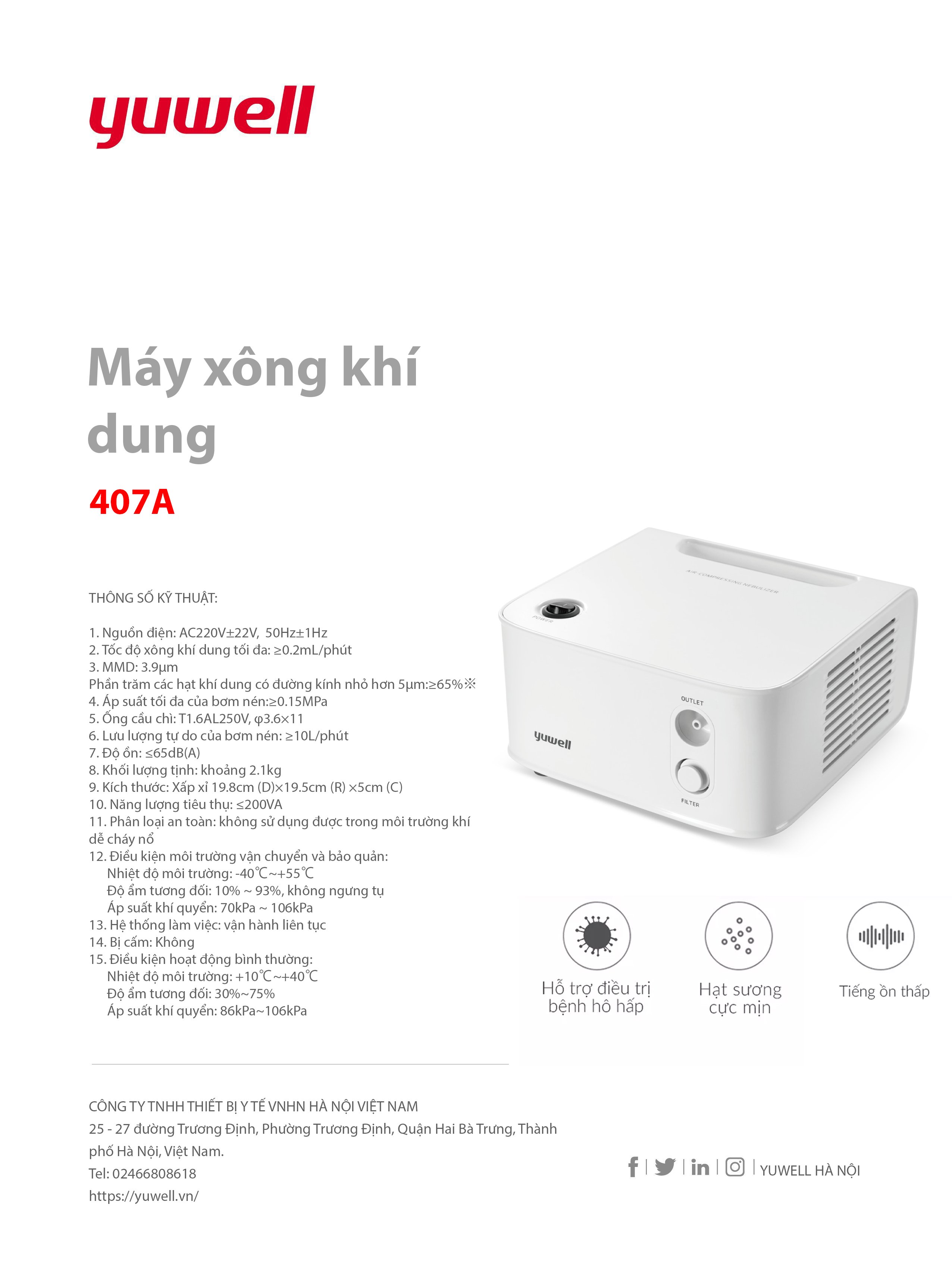 - Máy Xông Mũi Họng Khí Dung Yuwell 407A là thiết bị sử dụng van không dầu – hiệu suất cao đảm bảo vệ sinh cho người sử dụng, có độ ồn thấp.