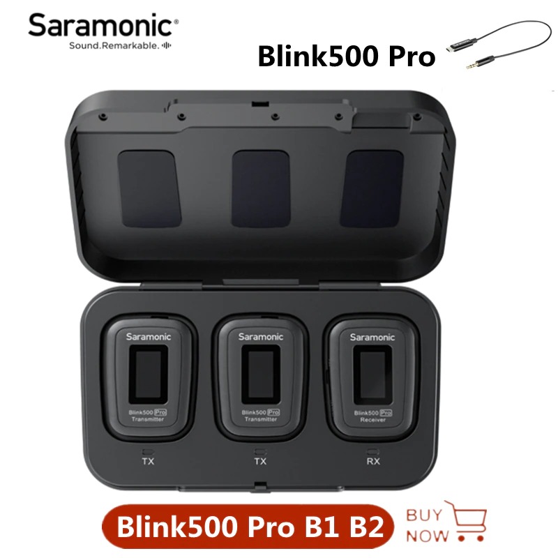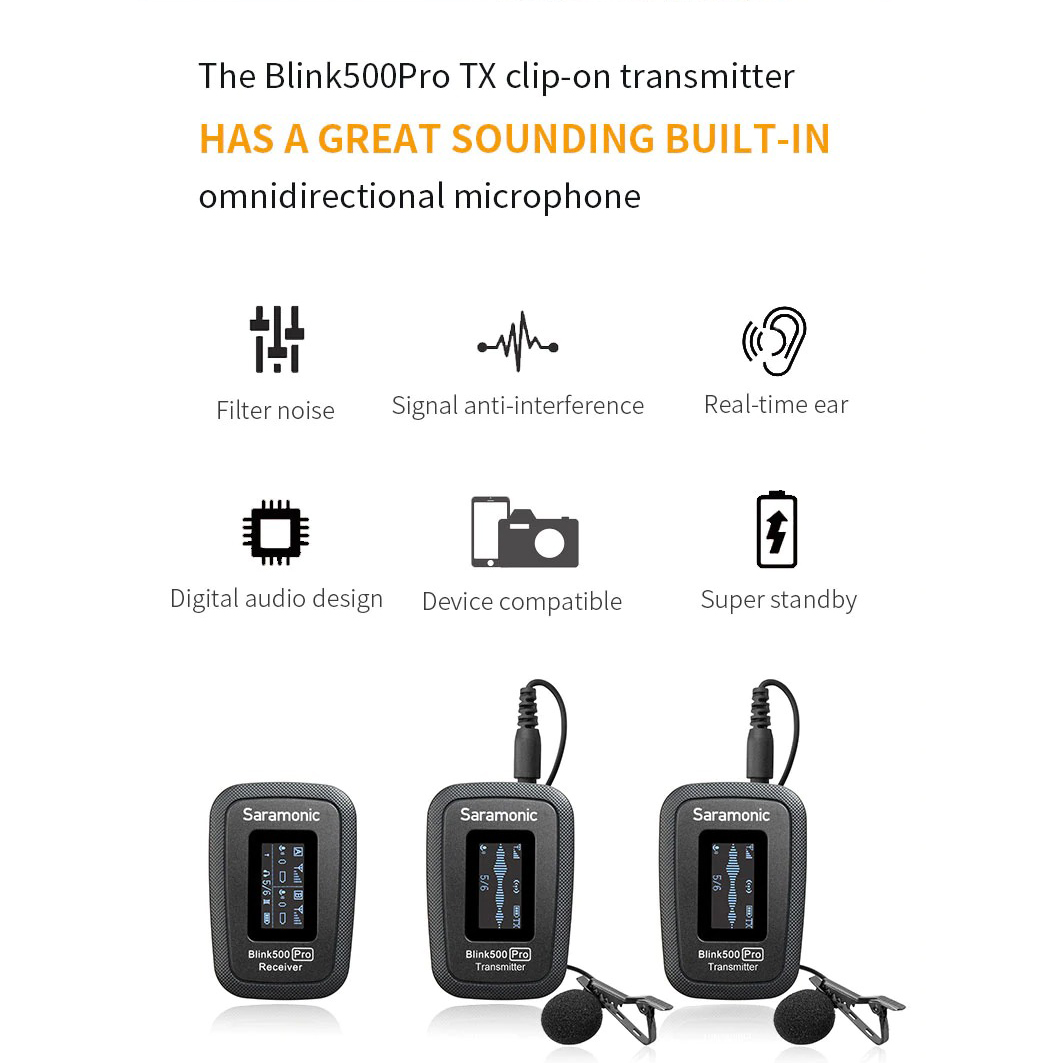 Saramonic Blink500 Pro B2 Saramonic Blink 500 Pro B2(TX+TX+RX) là bộ Microphone không dây tiện dụng, nhẹ, nhỏ gọn, dùng cho máy ảnh DSLR, Mirrorless và máy quay phim, hoặc các thiết bị di động, mang