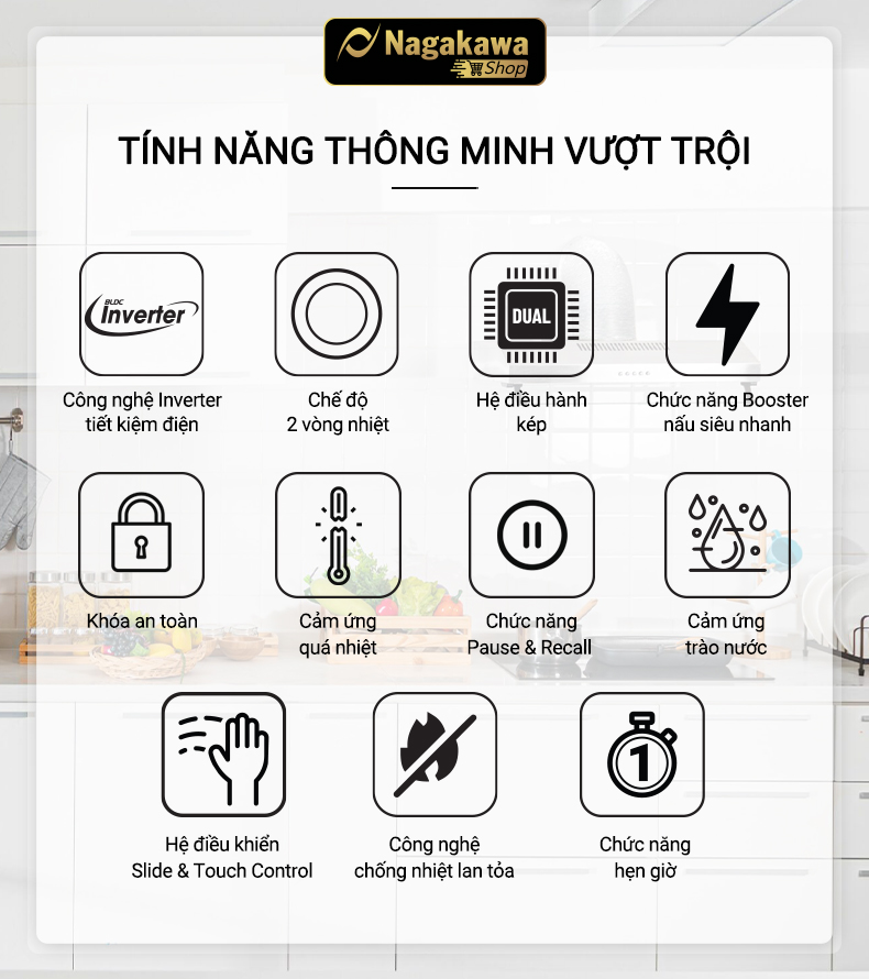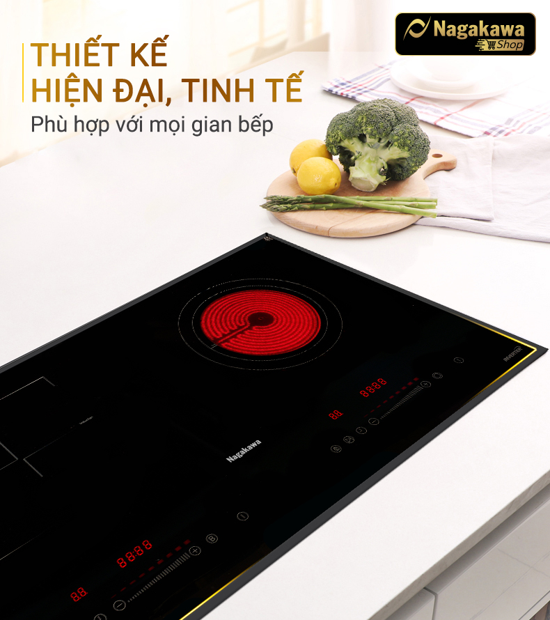 Đặc điểm nổi bật Bếp được tích hợp chức năng NaSYNC - Tự động kết nối điều khiển máy hút mùi nagakawa - Mỏng hơn 30% tiết kiệm không gian tủ bếp - Vật liệu