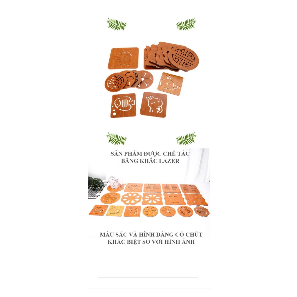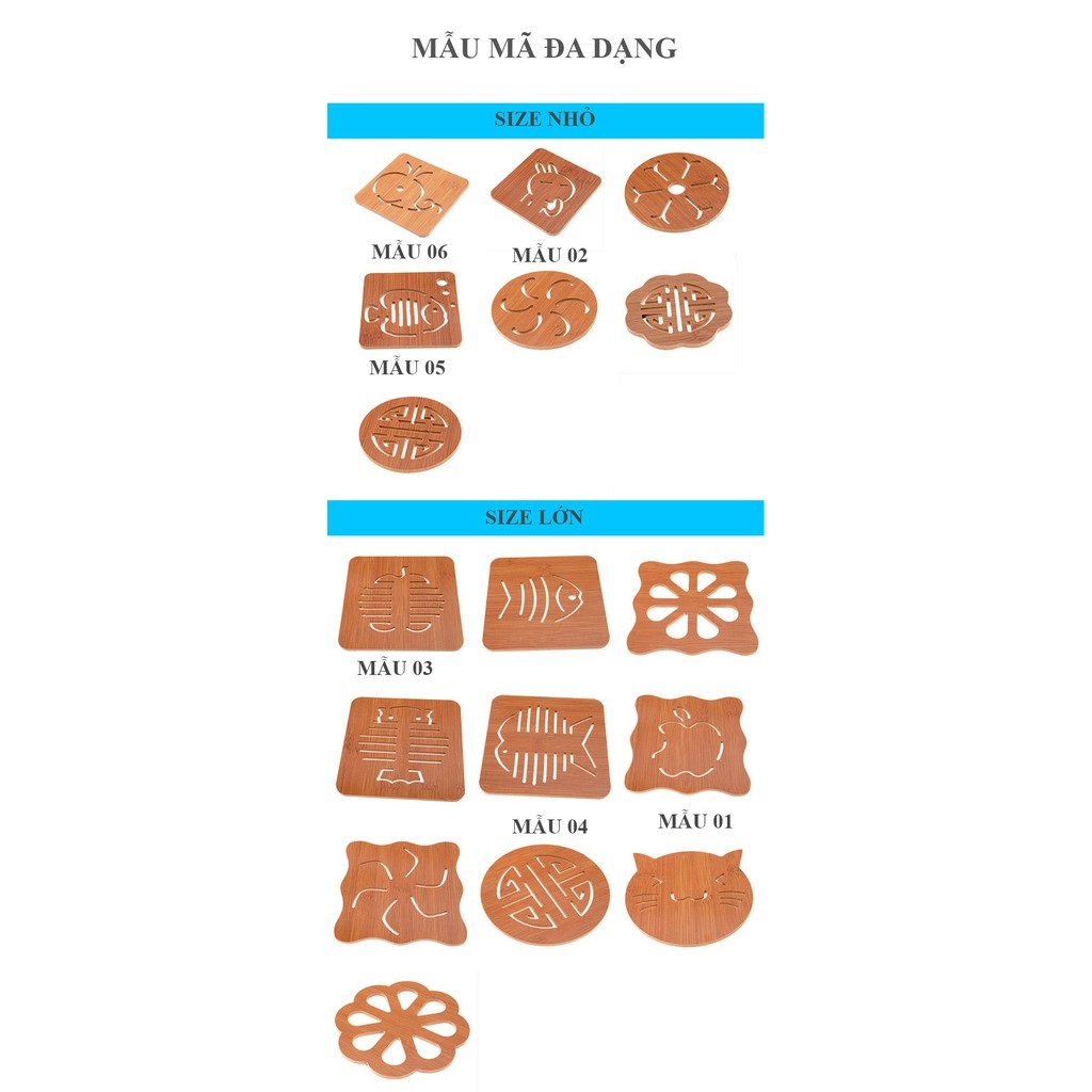 Miếng lót ly bằng gỗ gọn nhẹ, cứng cáp, cách nhiệt tốt, dễ dàng vệ sinh…Với nhiều mẫu khác nhau các bạn có thể chọn lựa các mẫu tùy thích. Với 2 kích thước khác nhau dành cho để ly và để nồi. Kích thước lớn có các nút cố định giúp cho nồi giữ vững không bị trơn trượt sau khi đặt lên.