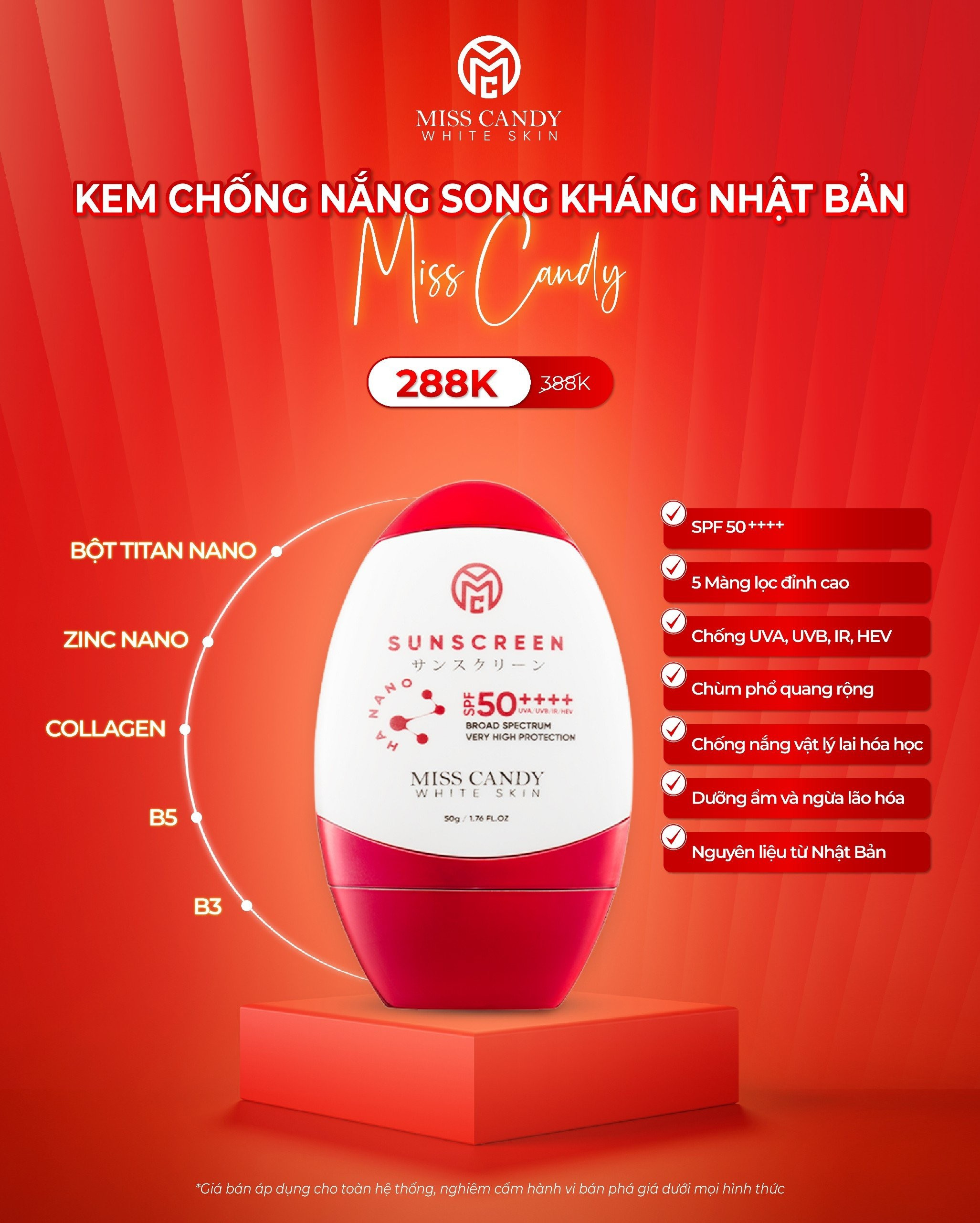 ![[MISS CANDY] Kem Chống Nắng Song Kháng Nhật Bản MISS CANDY SUNSCREEN HA NANO SPF 50,PA ++++ 50g, Chống Nước, Chống UVA/UVB, Chống Ánh Sáng Xanh & Tia Hồng Ngoại,Bảo Vệ Da Lên Đến 8 Tiếng - Gia Tuệ House](/datafiles/2025-16/thumbs/cef30e3609bb68a1cc821431ae600819.jpg)