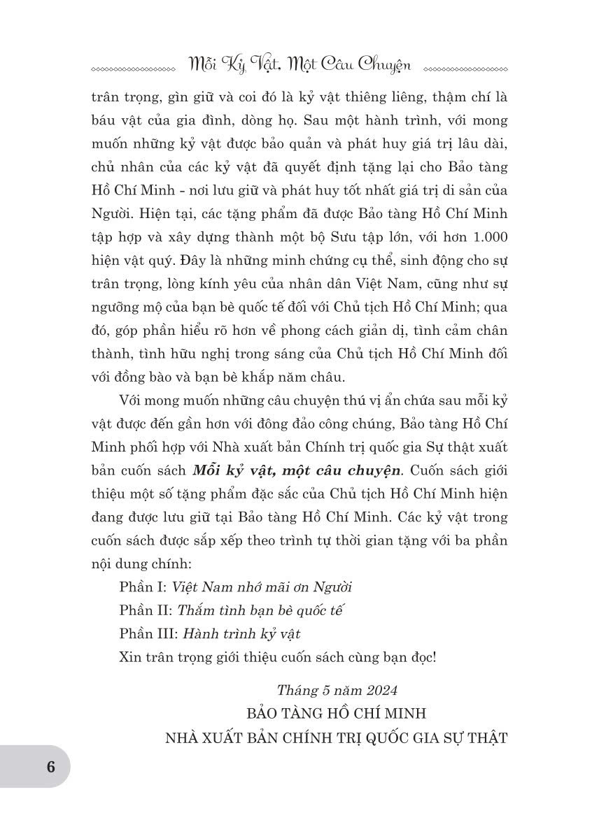 Với mong muốn những câu chuyện thú vị ẩn chứa sau mỗi kỷ vật được đến gần hơn với đông đảo công chúng. Bảo tàng Hồ Chí Minh phối hợp với Nhà xuất bản Chính trị quốc gia Sự thật xuất bản cuốn sách Mỗi kỷ vật, một câu chuyện. Cuốn sách giới thiệu một số tặng phẩm đặc sắc của Chủ tịch Hồ Chí Minh hiện đang được lưu giữ tại Bảo tàng Hồ Chí Minh. Các kỷ vật trong cuốn sách được sắp xếp theo trình tự thời gian tặng với ba phần nội dung chính: