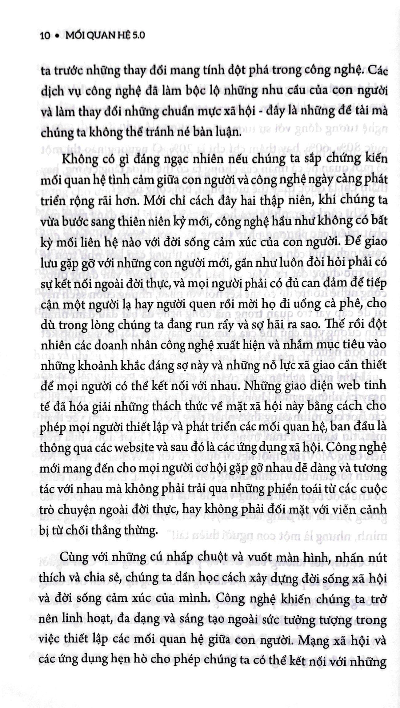 Trong khi nhiều người vẫn lo ngại về tình bằng hữu giữa con người và công nghệ thì cuốn sách Mối quan hệ 5.0 tiết lộ rằng những sự kết nối mới mẻ này không nguy hiểm như chúng ta nghĩ, mà thay vào đó, có thể khiến đời sống xã hội và cảm xúc của chúng ta trở nên phong phú và đa dạng hơn. Song, chúng ta phải đặt câu hỏi: Thời đại của mối quan hệ 5.0 như thế nào? Chúng ta nên chuẩn bị như thế nào cho một thời đại như vậy? Ai đã sẵn sàng tận dụng những thay đổi này, và tại sao? Cuốn sách sẽ dẫn người đọc ra khỏi nỗi sợ hãi và đi vào một thực tại mới. Nó mở ra những câu hỏi cơ bản đằng sau những điều thiết yếu như tình bằng hữu, niềm tin, và tình yêu, đồng thời cung cấp những ý kiến thú vị và bất ngờ về tương lai trong những năm sắp tới. Mục lục Lời giới thiệu Chương 1: Lịch sử các mối quan hệ và công nghệ